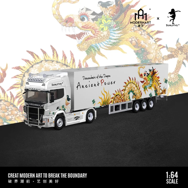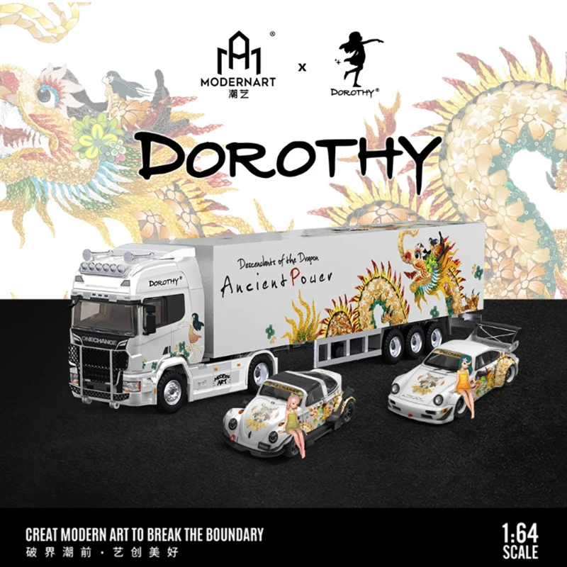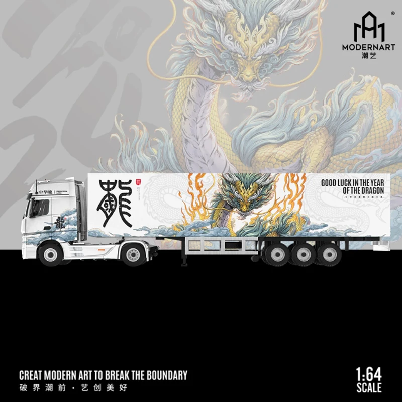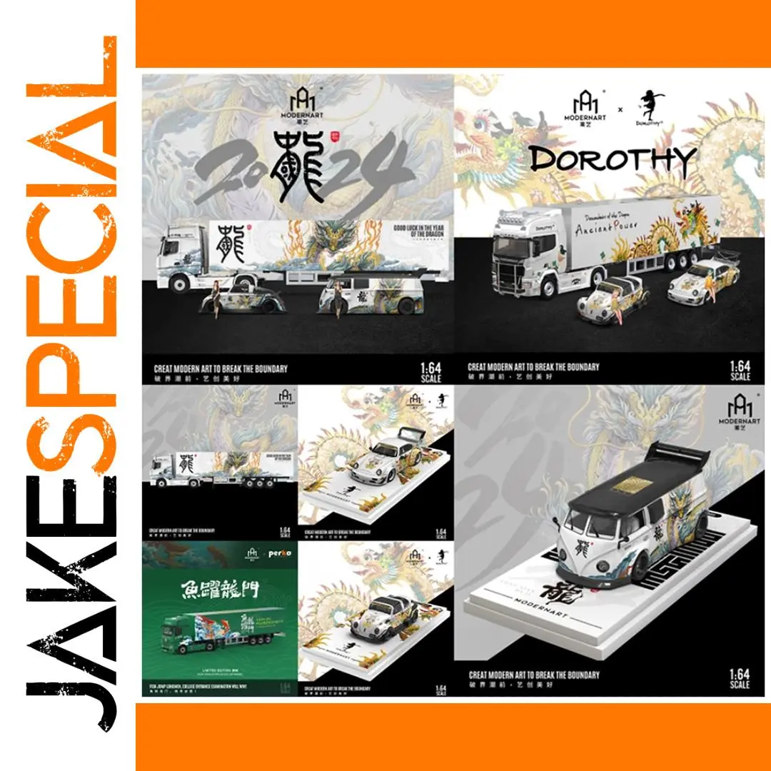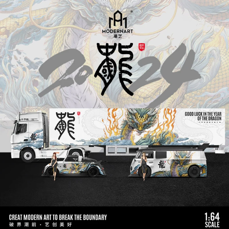 Experience the striking fusion of traditional Chinese artistry and modern transportation design with this 1/64 scale diecast alloy and plastic model set. Featuring a transport truck, van, and cargo container, each piece is adorned with intricate Chinese dragon motifs in vibrant reds, blues, and gold accents on sleek, glossy white surfaces. The collection includes an RWB 964 Porsche, VW T1 Van, and Actros container truck transporter, all crafted for static display, collection, or gifting. With detailed craftsmanship and culturally inspired designs, this new set offers a refined, visually captivating addition for adult collectors and enthusiasts, emphasizing premium quality and artistic elegance in a compact, eye-catching package.