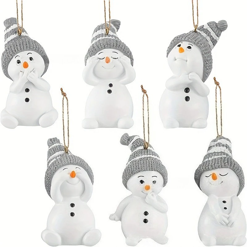 Bring festive charm to your holiday celebrations with this set of 6 or 12 Christmas-themed snowman decoration pendants. Crafted from a smooth, matte white material, each snowman features a cozy knitted gray hat with a ribbed texture and a playful pom-pom. Their expressive faces include small black eyes, orange carrot noses, and curved mouths, with rounded bodies adorned with black buttons, posed in various cheerful or contemplative stances. Suspended by delicate golden strings, these whimsical pendants are perfect for decorating Christmas trees, enhancing winter displays, or sharing as thoughtful party gifts, creating warm, joyful holiday memories.