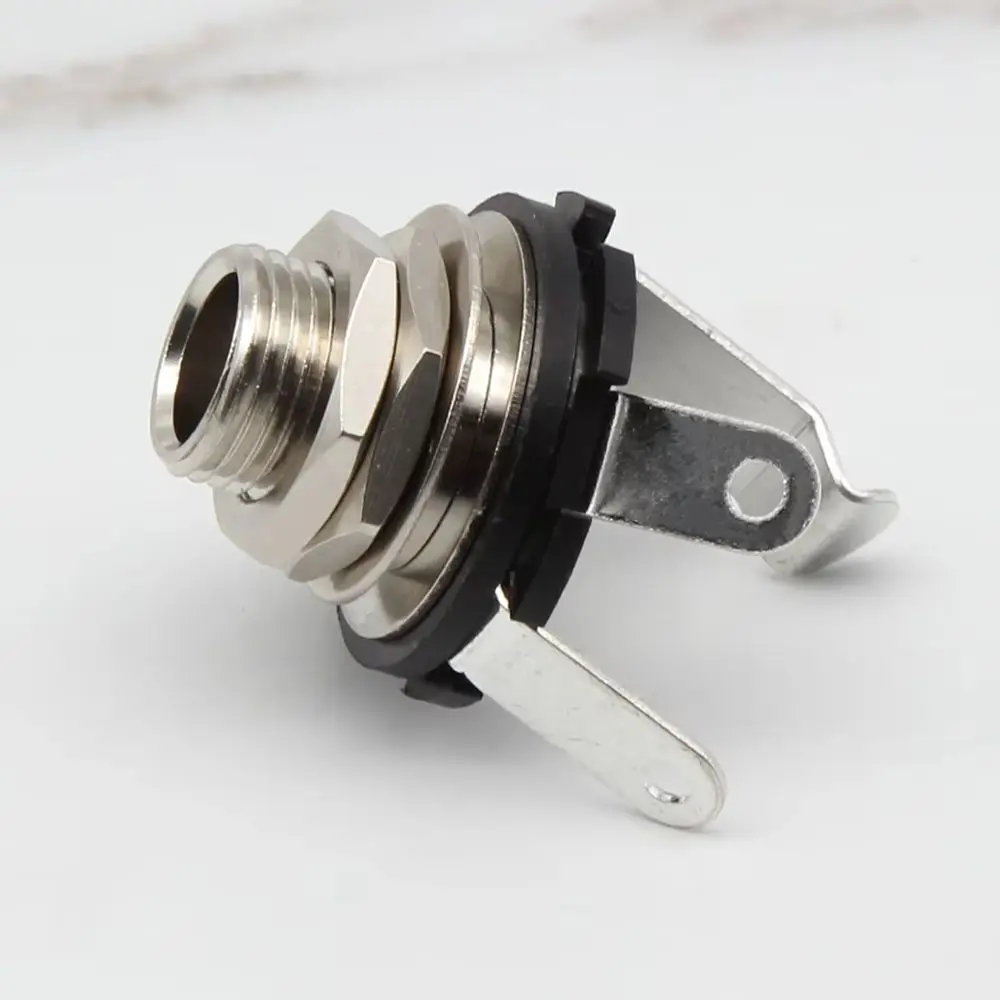 Imagine upgrading your electric guitar with this high-quality mono input jack to ensure reliable and seamless connection. Crafted from durable copper and plastic, it boasts a shiny chrome finish that adds a modern touch to your instrument. The cylindrical metal body features external threading, making installation secure and straightforward. The black gasket-like ring surrounding the front offers an airtight seal, protecting your electronics from dust and moisture. Included with this component are a sturdy nut and washer, providing all necessary hardware for a proper fit. Designed for precision and durability, this input jack guarantees a dependable connection to your guitar cable, helping you focus on your sound without interruption or concern for loose connections.