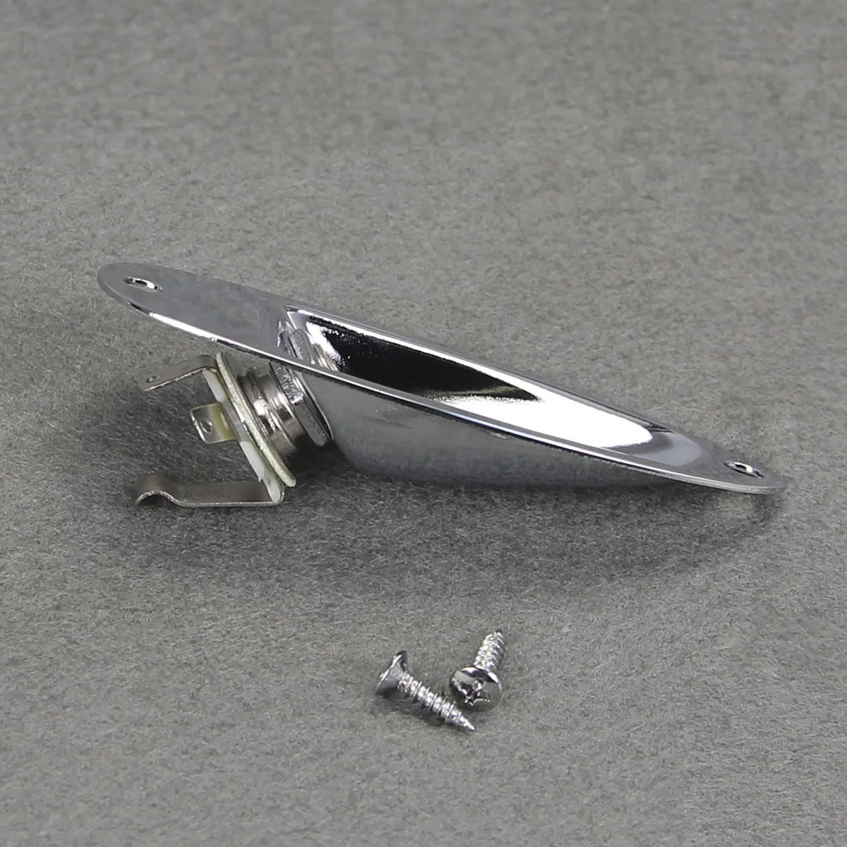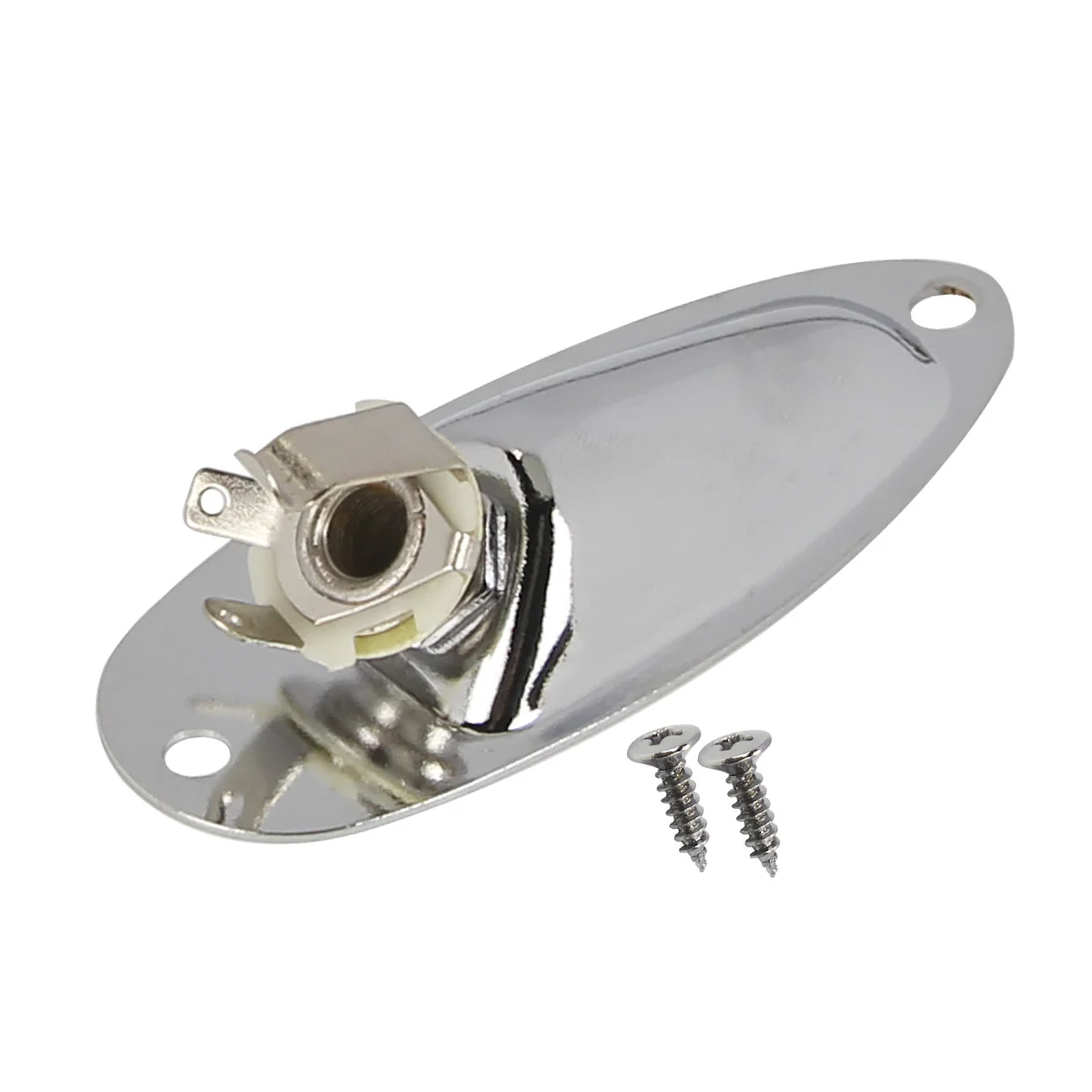 Enhance your electric guitar with this stylish chrome boat-style guitar jack, designed to provide reliable input and output connections. Crafted from solid metal, it offers durability with a polished, reflective finish that adds a modern touch to your instrument. The oval-shaped plate features smooth, rounded edges for an elegant look, while the embedded cylindrical jack socket ensures a secure connection for your 1/4 inch (6.35mm) guitar cable. Compatible with ST-style and similar guitars, this jack is easy to install, thanks to the precise mounting screw spacing of approximately 2.79″ (71mm). Its robust construction guarantees long-lasting performance, making it an ideal replacement or upgrade for worn-out hardware and ensuring an optimal connection for your sound. Enjoy a reliable, stylish upgrade for your guitar today!