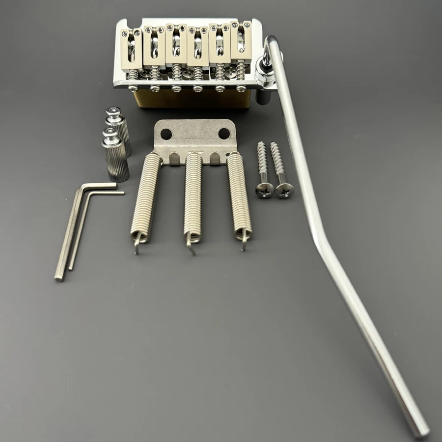 Imagine upgrading your guitar to achieve better tuning stability and tonal richness, all while adding a touch of sophisticated shine. This chrome brass tremolo bridge offers both performance and style, elevating your playing experience to professional levels. Easy to install and built to last, it’s the perfect choice for serious guitarists looking to improve their instrument’s response. Don’t miss out on enhancing your guitar’s potential—bring this high-quality component into your setup today and enjoy the difference it makes to your music.