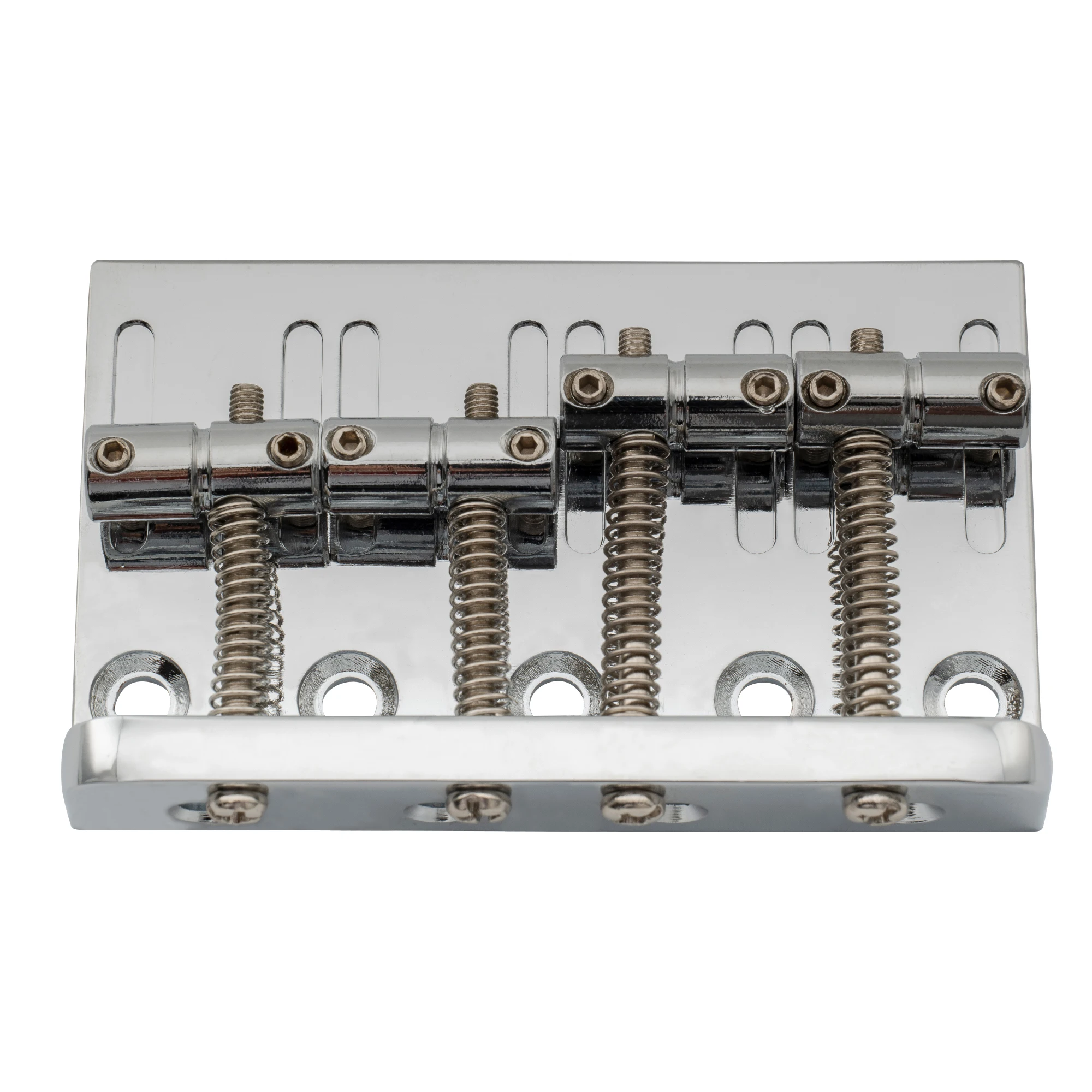 Experience a perfect blend of vintage charm and modern durability with this chrome-plated, top-loading fixed hardtail bass bridge. Designed specifically for 4-string Fender Precision and Jazz basses, it features a sleek, polished chrome finish that reflects light beautifully, giving your instrument a stylish upgrade. The rectangular zinc alloy plate, with smoothly rounded edges, offers stability and longevity, while vintage-style barrel saddles deliver classic tone and character. The six adjustable saddles allow for precise string height and intonation adjustments, ensuring optimal sound quality. Its minimalist cylindrical columns, aligned in a straight row, emphasize both functionality and aesthetic appeal. Whether you're replacing an old bridge or upgrading your bass, this component combines style and performance to elevate your playing experience.