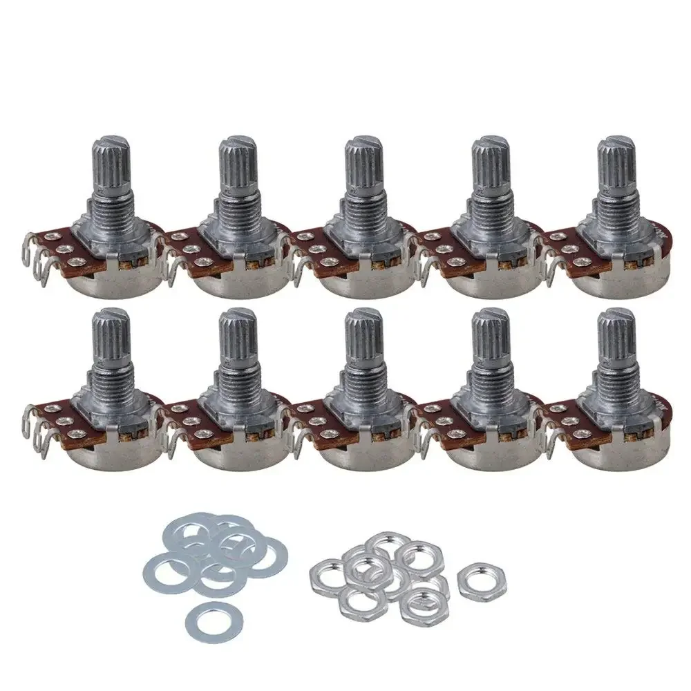 Enhance your electric guitar’s performance with this set of 10 chrome-colored metal potentiometers, each with a B100K-ohm resistance ideal for tone and volume control. Designed with a 6mm shaft diameter, 15mm shaft length, and overall dimensions of 24mm in length and 21.5mm in width, these durable components feature a sleek, industrial aesthetic. The rounded base has a 16mm diameter, and the set includes nuts and gaskets for secure installation. Perfect for guitars requiring a 15mm potentiometer, this set provides reliable, high-quality replacement parts to ensure precise adjustments and maintain the integrity of your instrument’s sound.