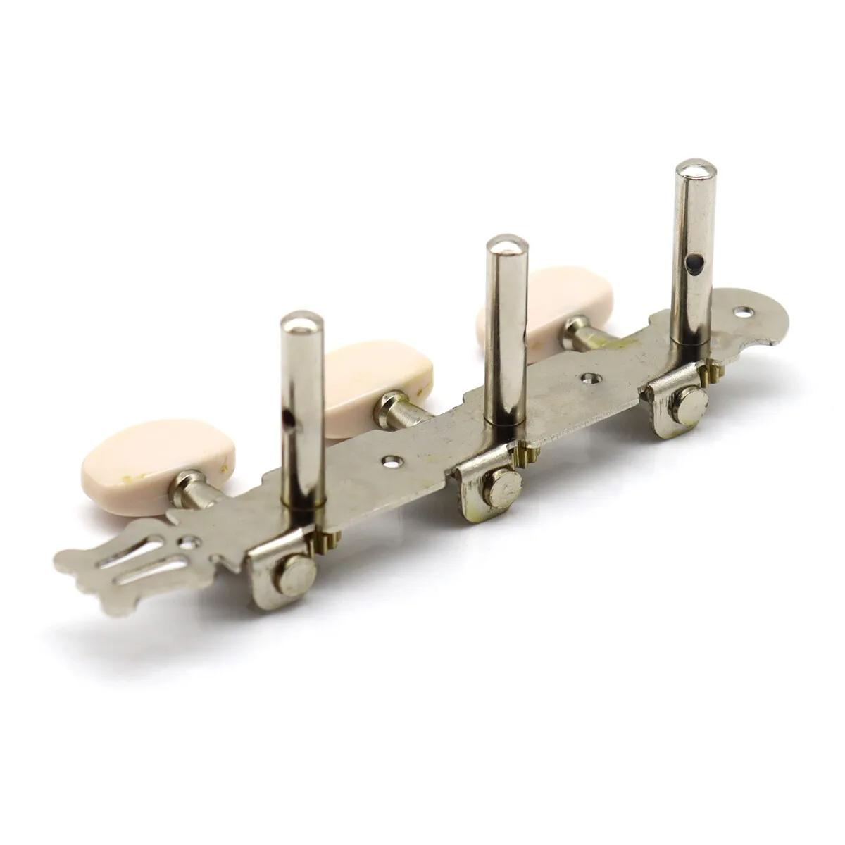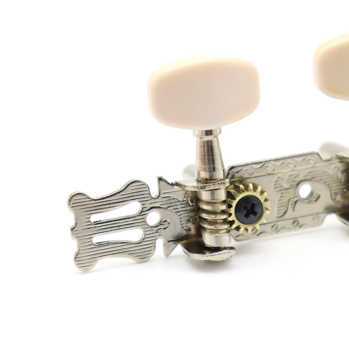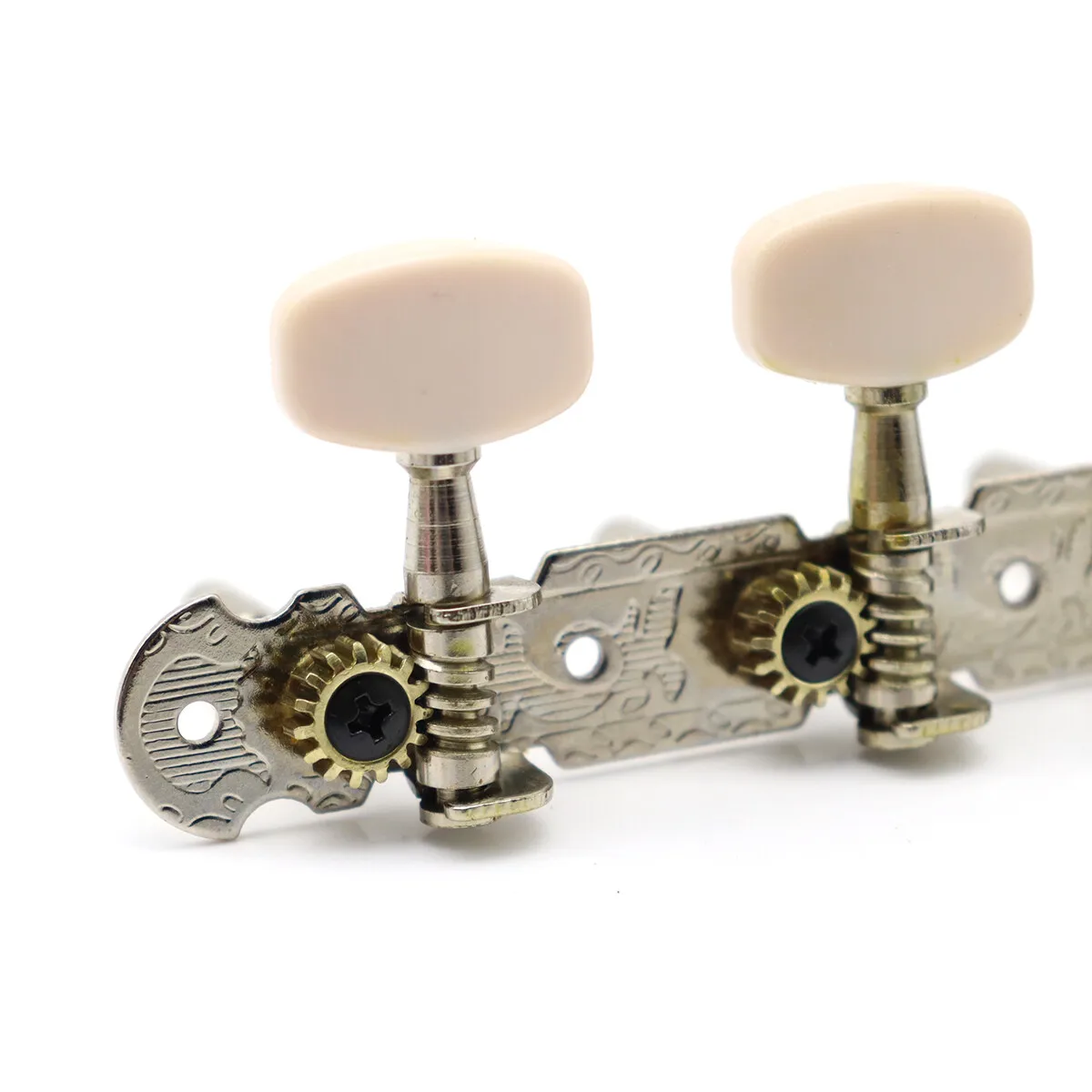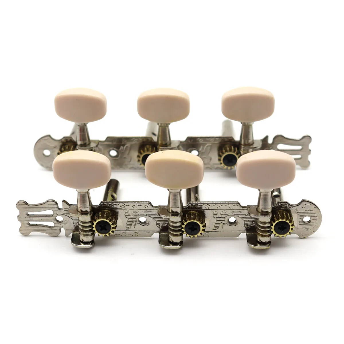 Experience precise tuning with this set of chrome-plated guitar machine heads, perfect for restoring or upgrading your 40-inch classical guitar. Crafted with a durable steel body and smooth, beige plastic buttons, these tuners combine sleek aesthetics with functional reliability. The heavy-duty internal gears and a gear ratio of 1:15 ensure smooth and accurate string tension adjustments. With a standard installation diameter of 6mm and 35mm spacing between pegs, they fit most classic guitars seamlessly. The set includes both right and left-handed tuners, making installation straightforward. The shiny chrome finish adds a modern touch, enhancing your guitar’s appearance. Enjoy better tuning stability and a professional look with these high-quality, easy-to-install replacement tuners designed to last for years.