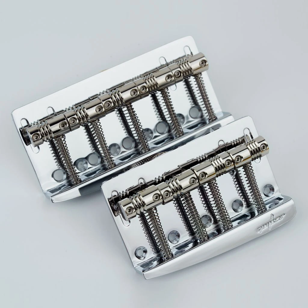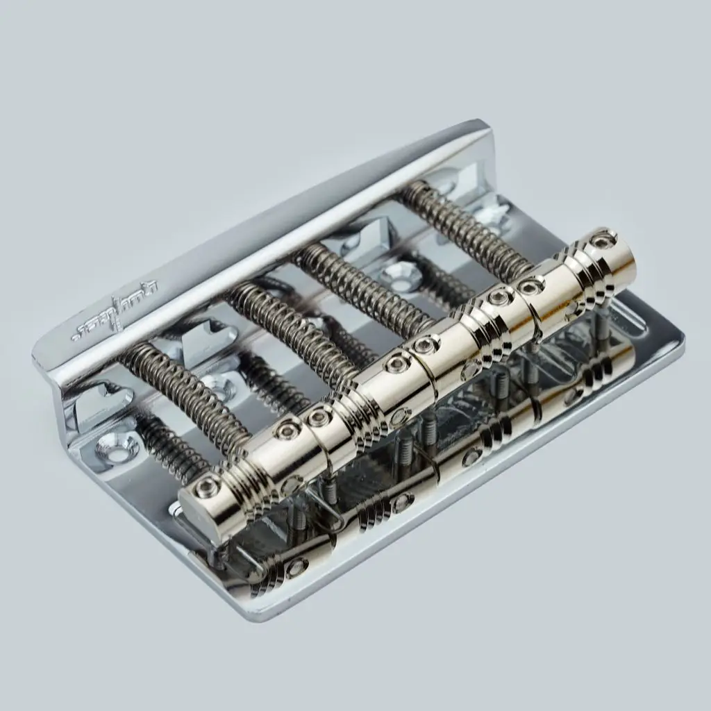 Experience the perfect blend of durability, style, and precision with this high-quality chrome bass bridge. Designed to fit both 4-string and 5-string bass guitars, it features a polished, mirror-like finish that adds a sleek modern look to your instrument. The sturdy rectangular base plate with rounded edges ensures stability and a professional appearance. Six adjustable cylindrical saddles with grooved sections provide precise string placement and intonation, enhancing your performance. The interconnected metallic springs offer balanced tension and stability, supporting consistent sound quality. Weighing only 200 grams, this bridge offers lightweight efficiency without sacrificing robustness. Easy to install, it transforms your bass, providing improved sustain, tuning stability, and a clean aesthetic.