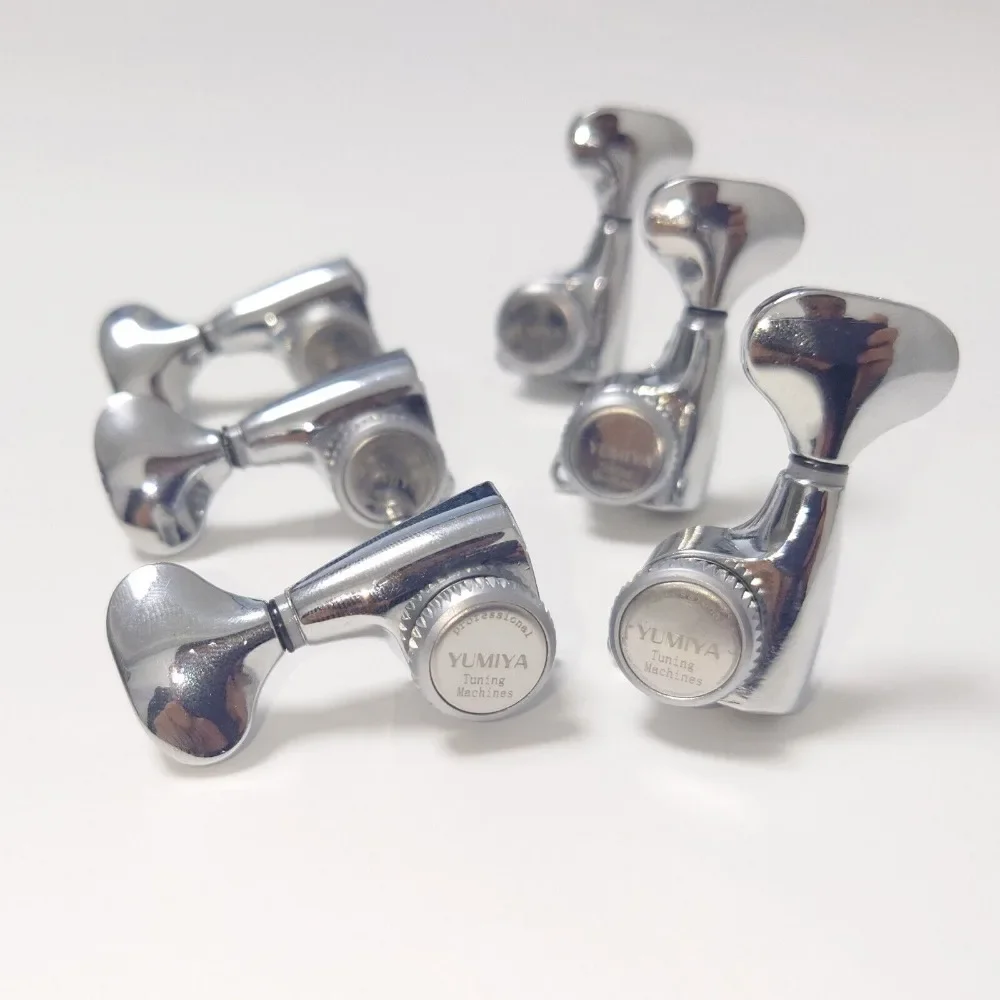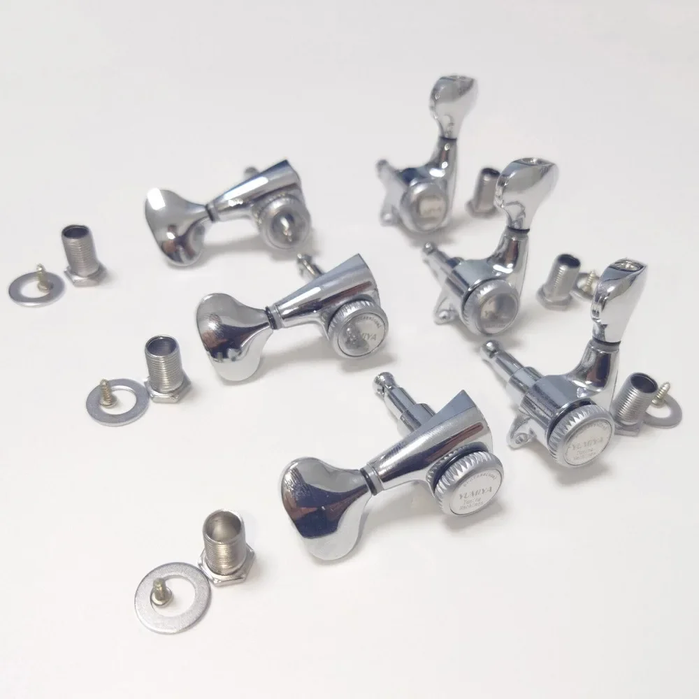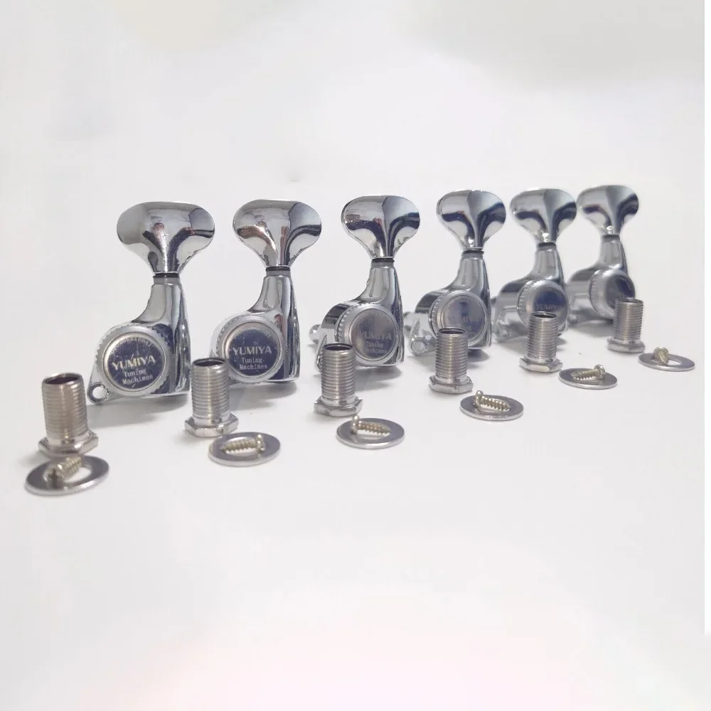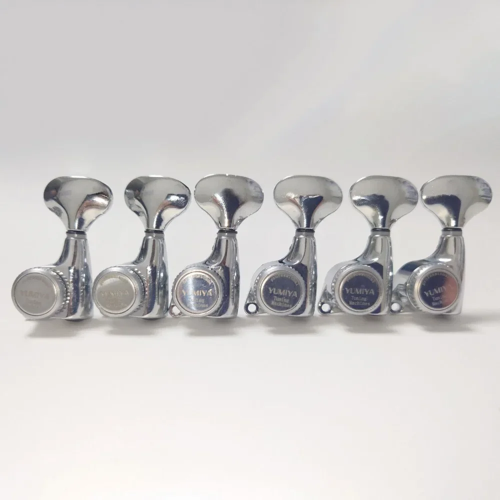 Enhance your guitar's performance and aesthetic with this set of six chrome locking tuners by Yumiya. Crafted with a sleek, polished chrome finish, these tuners feature highly reflective, mirror-like surfaces that add a modern touch to any guitar. Their rounded, domed buttons provide a comfortable grip while maintaining a contemporary, streamlined look. The precise internal gears, made of durable nickel and steel, offer a reliable 1:21 gear ratio for smooth and stable tuning. Designed for 6-string guitars, these locking tuners ensure secure string attachment, minimizing slippage and improving tuning stability. The included ferrules and screws make installation straightforward. Perfect for professional setups or custom projects, these hardware components combine craftsmanship and style seamlessly.