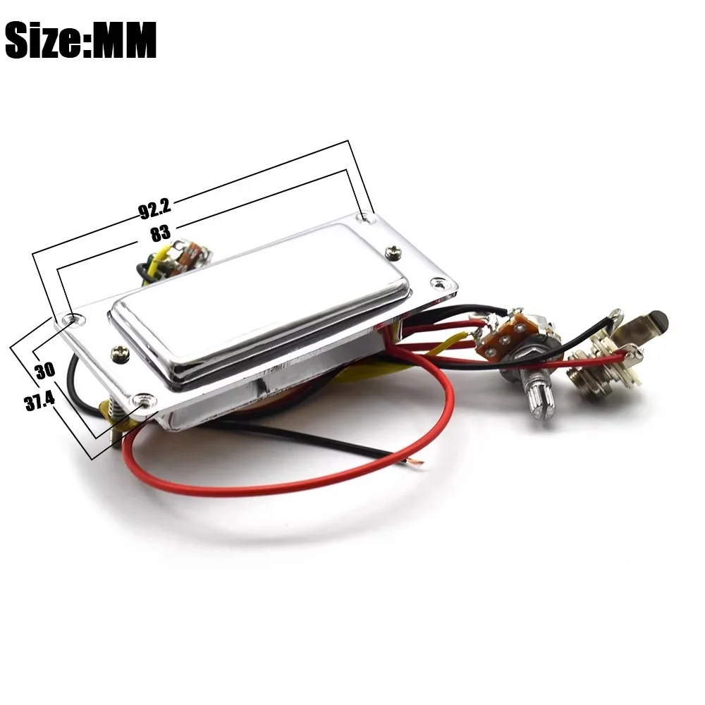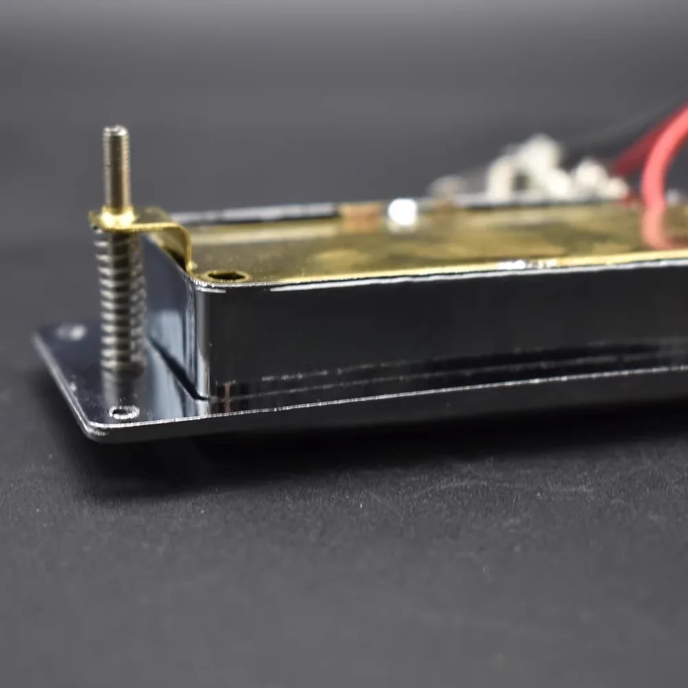 Enhance your LP-style electric guitar with this sleek mini double coil pickup, featuring a durable chrome alloy metal construction and a resistance of 12K ohms. Designed for guitars with a 6.35V output, this compact pickup offers a reflective, polished surface accented by a gold-colored cover, combining modern aesthetics with rugged functionality. Its precise, minimalist design includes four mounting screws and threaded posts for secure installation, ensuring reliable performance. Ideal for nylon or metal body guitars, this high-quality replacement part is a perfect upgrade to elevate your sound and style, seamlessly blending technical excellence with a sophisticated industrial look.