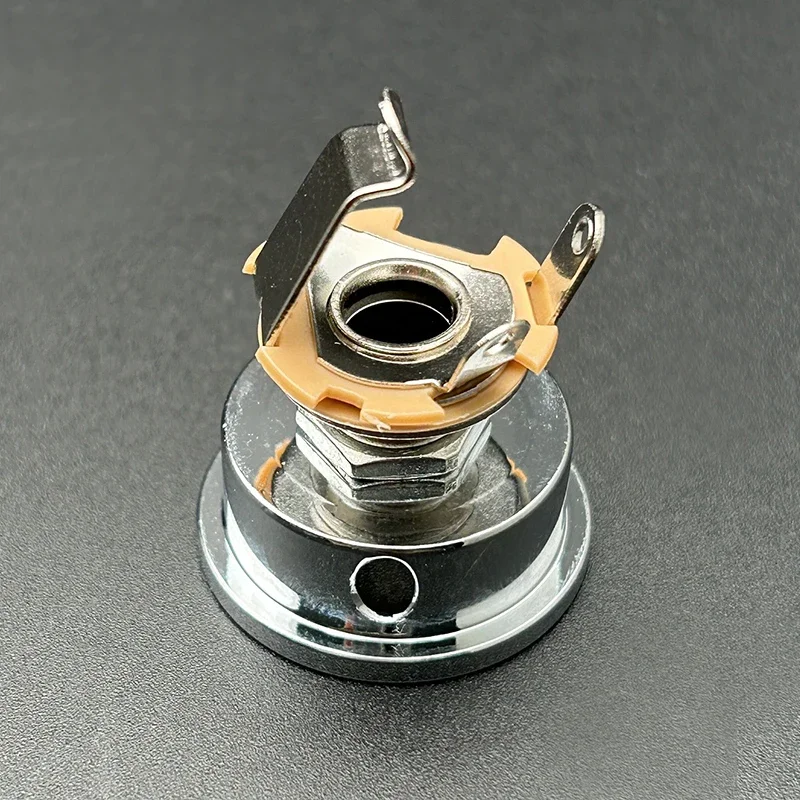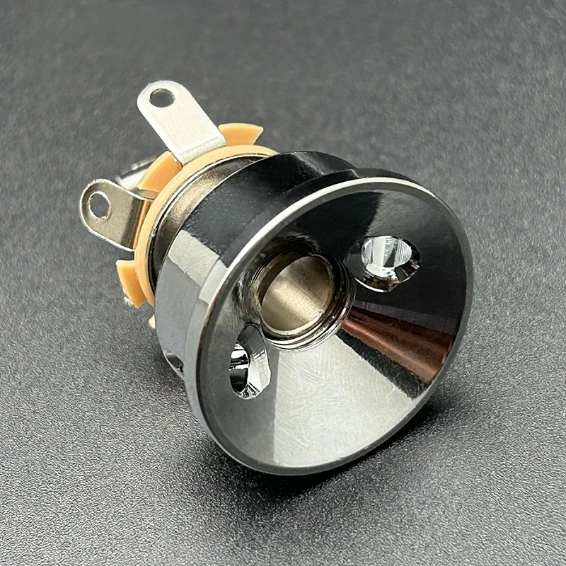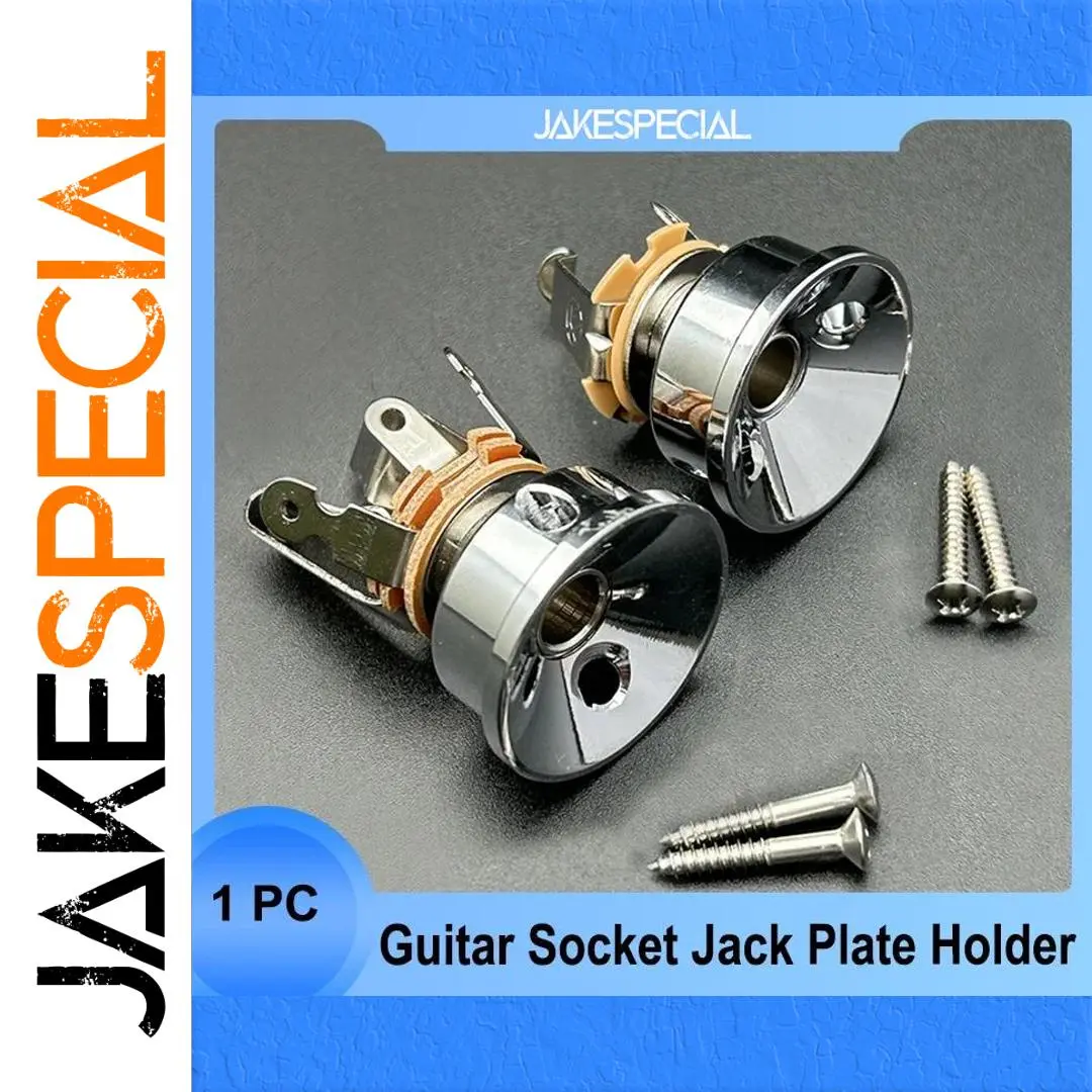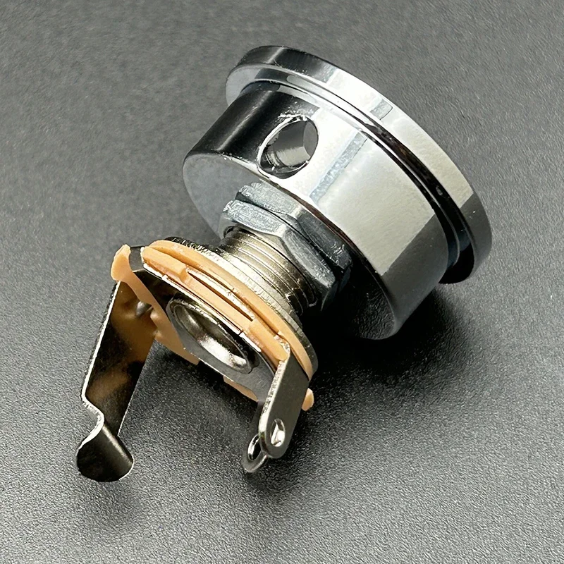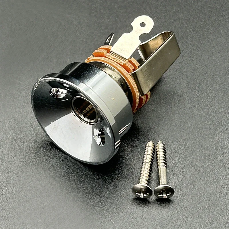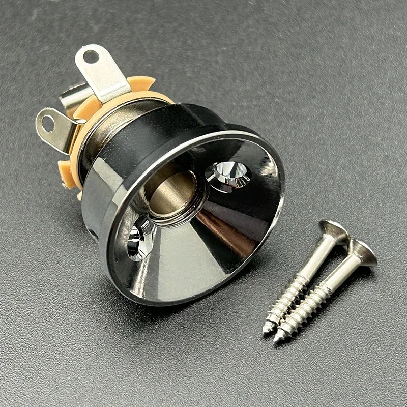 Enhance your electric guitar with this chrome-plated recessed jack electro-socket assembly. Featuring a 6.35mm jack output, the holder stands approximately 2mm proud of the guitar surface and has a depth of 9.5mm (0.38 inch). A circular cutout of 22mm (0.85 inch) in diameter is required for installation, ensuring a perfect fit. The assembly includes a secure jack socket and comes with 2 wood screws for easy attachment. This combination of functionality and sleek chrome finish not only provides durability but also elevates the aesthetic appeal of your instrument. Perfect for any electric guitar enthusiast looking to upgrade.