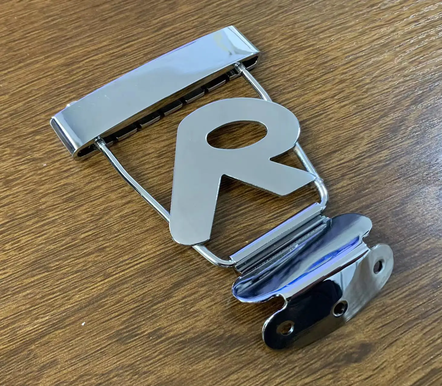 Experience the perfect blend of durability and sleek design with this professional R tailpiece bridge for electric guitars. Crafted from high-quality chrome-plated steel, it boasts a smooth, reflective surface that adds a modern, sophisticated touch to your instrument. The rectangular top section with rounded edges anchors your strings securely while the large stylized “R” cut-out enhances the visual appeal, making your guitar stand out. The sturdy supporting prongs and a rounded mounting bracket ensure optimal stability and easy installation. Whether you're upgrading or customizing your guitar, this tailpiece elevates both style and performance. It's designed to fit most electric guitar models, providing a reliable, professional look that complements any guitar aesthetic.