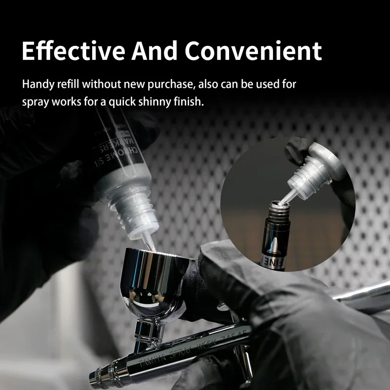 Experience precision and brilliance with this this Chrome Silver Refill Marker, Model CR-10, perfect for airbrush spray painting and detailed hobby projects. Its sleek, cylindrical design features a highly reflective, chrome silver finish that mimics a polished mirror surface, adding a modern and sophisticated touch to your tools. Crafted from durable composite material, this 10ml marker offers consistent spray performance for model building, DIY crafts, and detailed finishes. Its non-electric and chemical-free construction ensures safe, environmentally friendly use. The lightweight, compact shape makes it easy to handle, providing excellent control for detailed work. Whether you're customizing cars, miniatures, or other projects, this refill marker brings a high-quality metallic sheen to your creations, making your work stand out with a luminous mirror-like gloss.