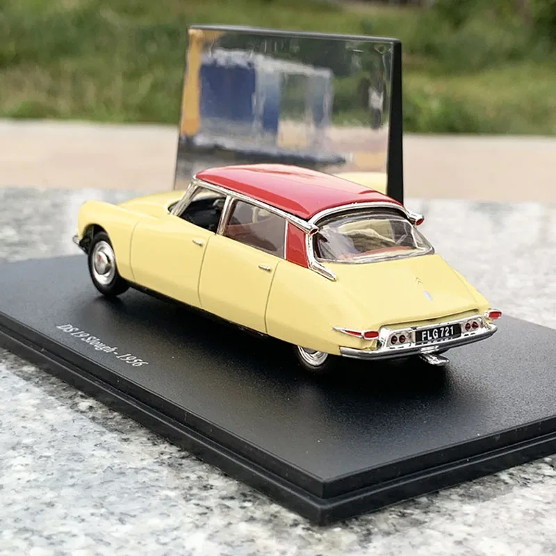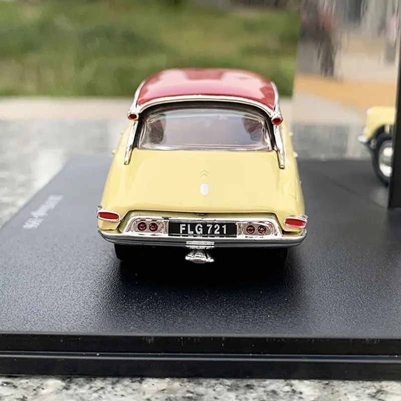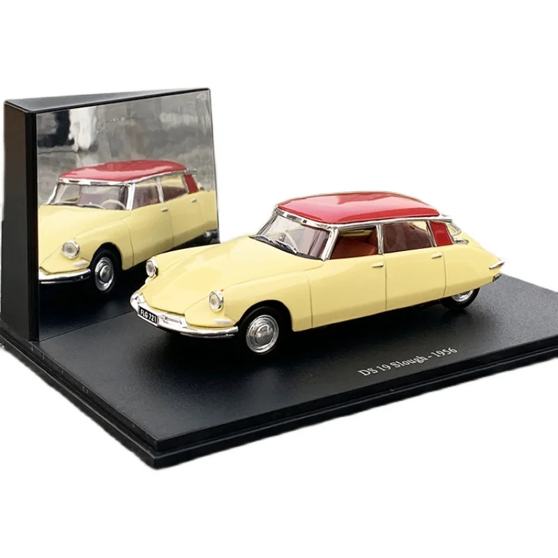 This high-quality diecast model car captures the classic elegance of the 1956 DS 19 Slough in 1:43 scale, measuring 10 cm in length. Crafted from alloy with intricate detailing, it features a soft pale yellow body contrasted by a vibrant red roof, complemented by metallic silver accents on the bumpers, wheels, and trim. The transparent windows reveal a minimalist interior, while the sleek body lines highlight its vintage aerodynamic design. Suitable for collectors and display enthusiasts, this non-operational miniature is intended for mature audiences and arrives in its original box. Perfect for adding a sophisticated touch to any collection or display setting.