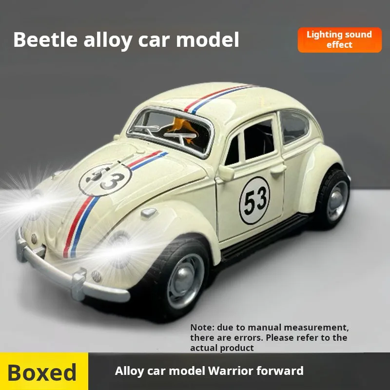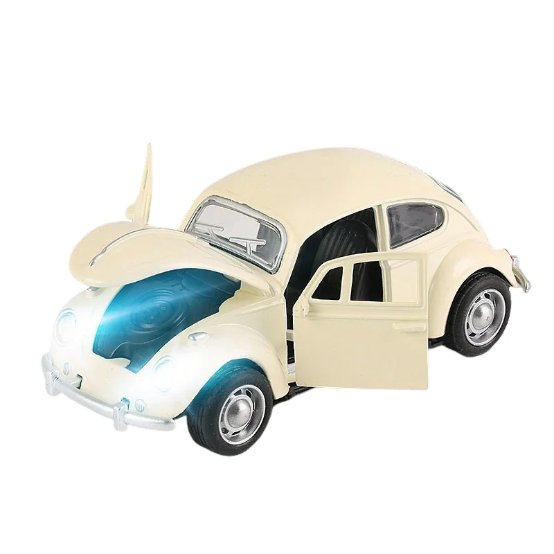 Imagine adding a stunning miniature of a vintage Beetle to your collection or giving a perfect gift that delights both children and collectors. This meticulously crafted die-cast toy draws you in with its glossy, black zinc alloy finish that beautifully captures the iconic rounded shape of the classic Beetle. The detailed headlights glow bluishly, and the transparent windshield showcases carefully marked window frames. Its sleek chrome accents, such as the strip on the bumper, add an elegant touch. The rubber tires with realistic tread patterns and polished silver rims complete the look. With functional features like opening doors and pressable wheel lights, this model combines sophistication and playfulness perfectly. Its durable construction ensures lasting enjoyment.