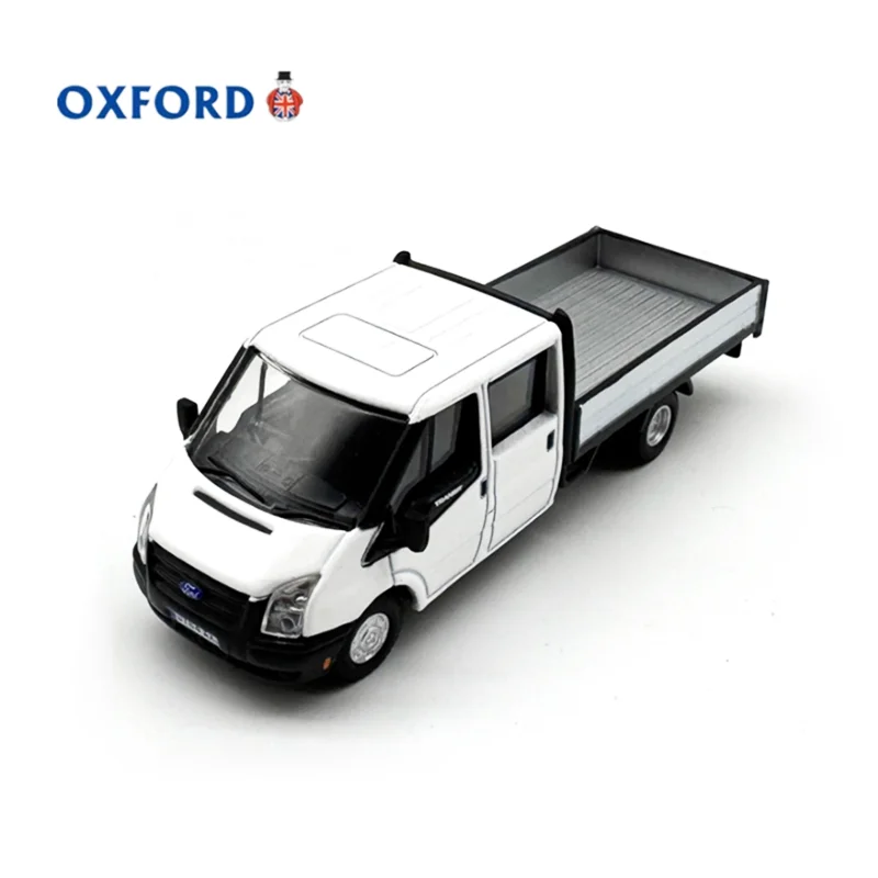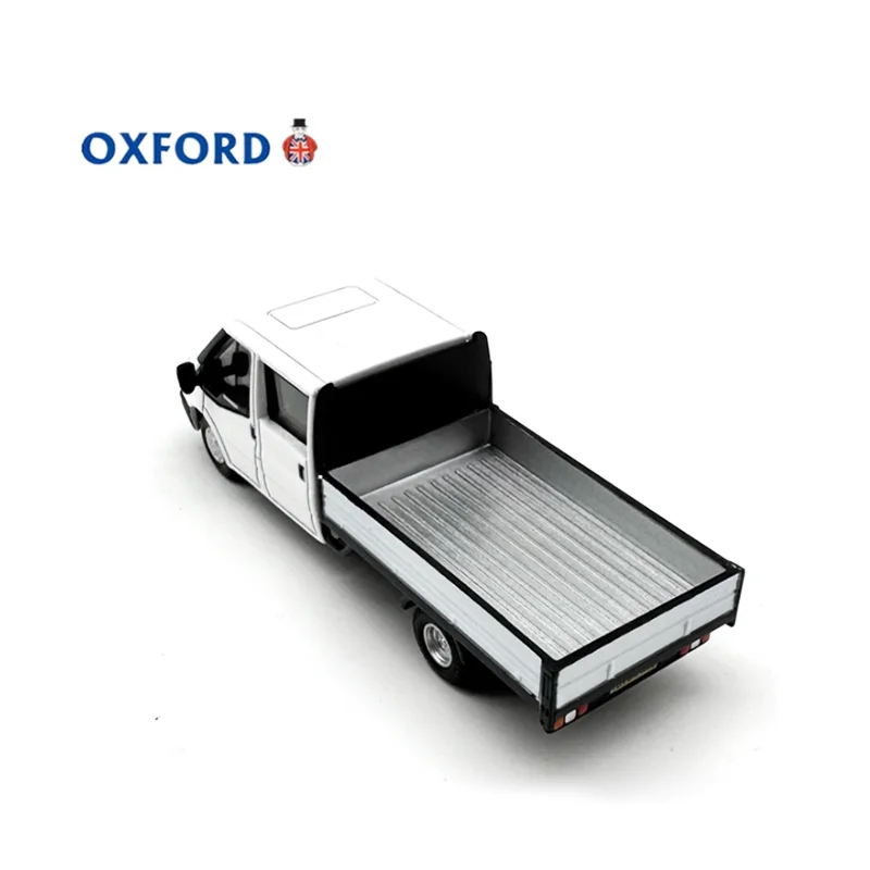 - The diecast model features a white cab with black accents on grille, bumper, side mirrors, and textured flatbed, emphasizing a clean, minimalist, utilitarian style.