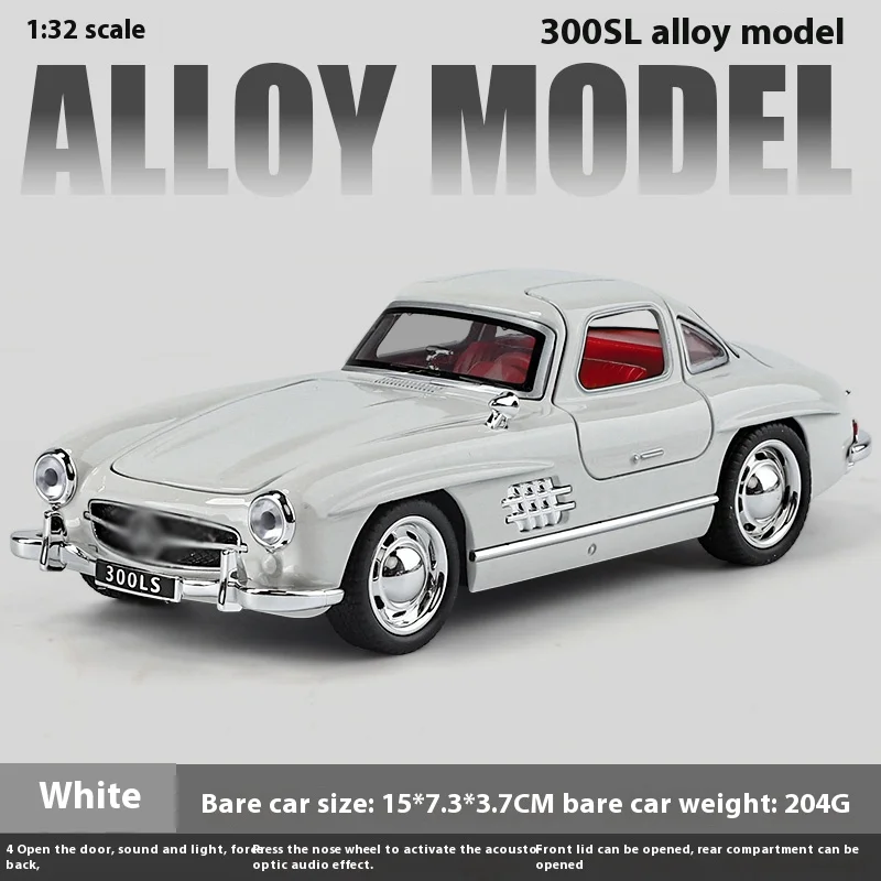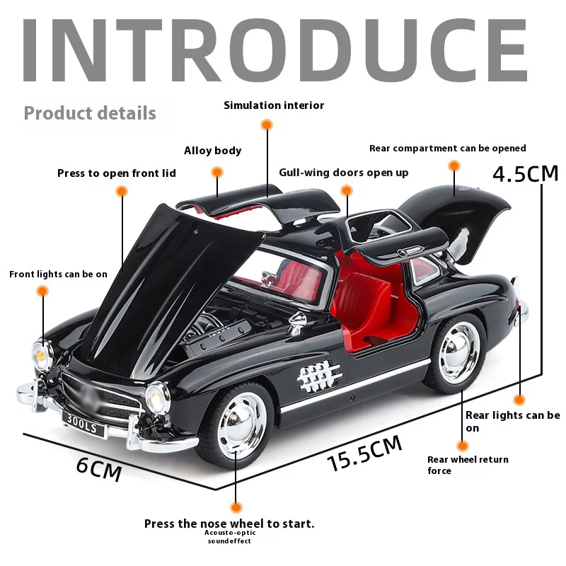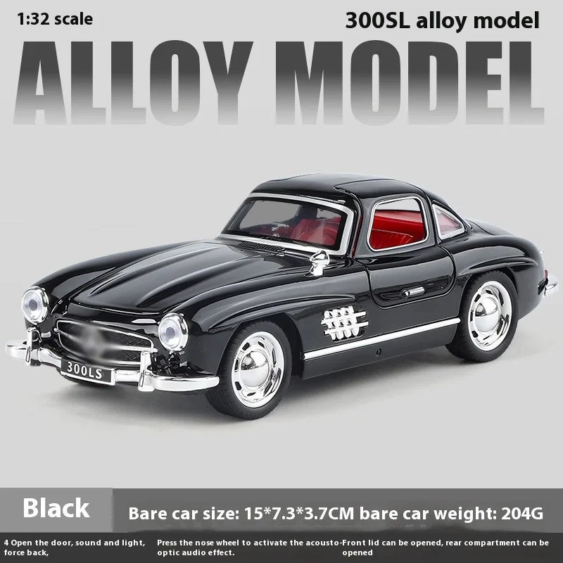 The classic 300SL die-cast model is meticulously crafted from zinc alloy, weighing 0.4 kg and designed as a stunning ornament for your car center console. This retro masterpiece features an elegant black body with shiny chrome accents on the grille and wheels, paired with distinctive gullwing doors that reveal vibrant red upholstered seats. Available in four color options—white, red, green, and black—this exquisite model exemplifies timeless automotive design, making it a perfect decorative accessory for enthusiasts looking to enhance their car interiors.