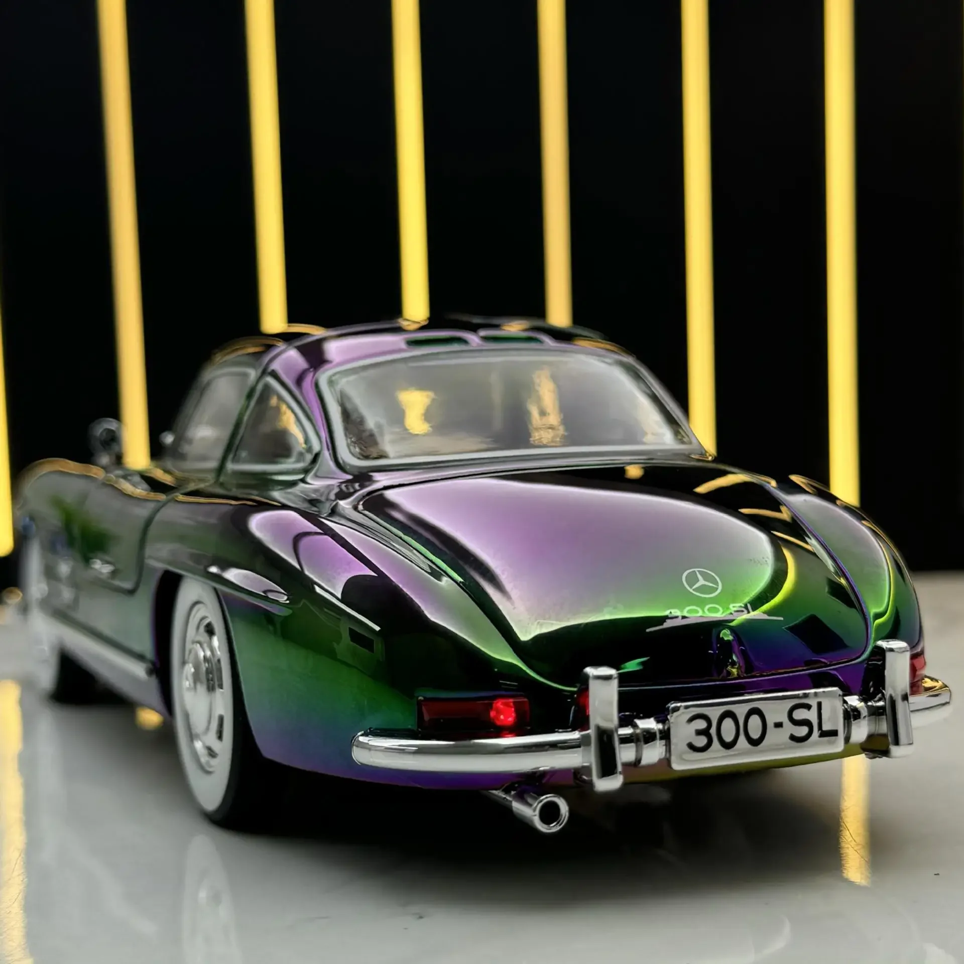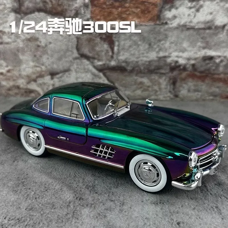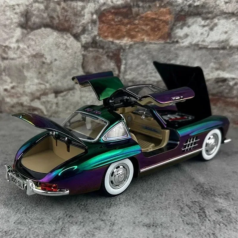 Experience the timeless beauty of the Mercedes-Benz 300SL with this stunning 1:24 scale diecast model. Adorned in a vibrant purple and green gradient, this collectible showcases an electroplated alloy finish that gleams with sophistication. The sleek design, complete with detailed features like chrome-rimmed whitewall tires and impressive blue-tinted headlights, embodies a perfect blend of classic and modern aesthetics. As you admire this model, envision it displayed in your collection, sparking conversations and admiration from fellow enthusiasts. The intricate interior details enhance its realism, making it a delightful centerpiece for any space dedicated to automobile legacy.