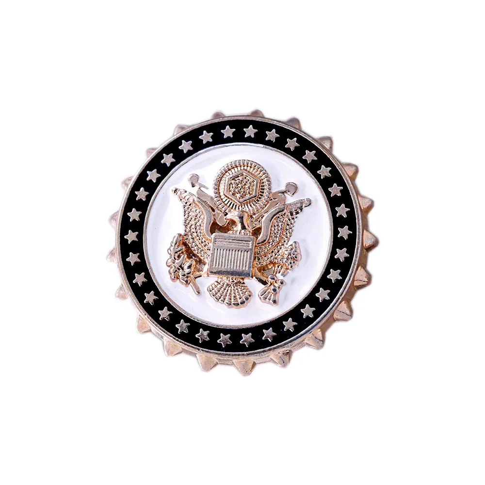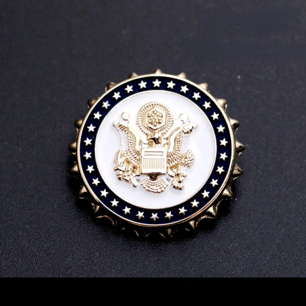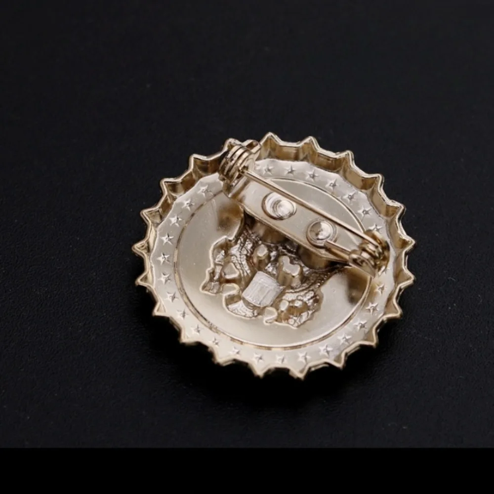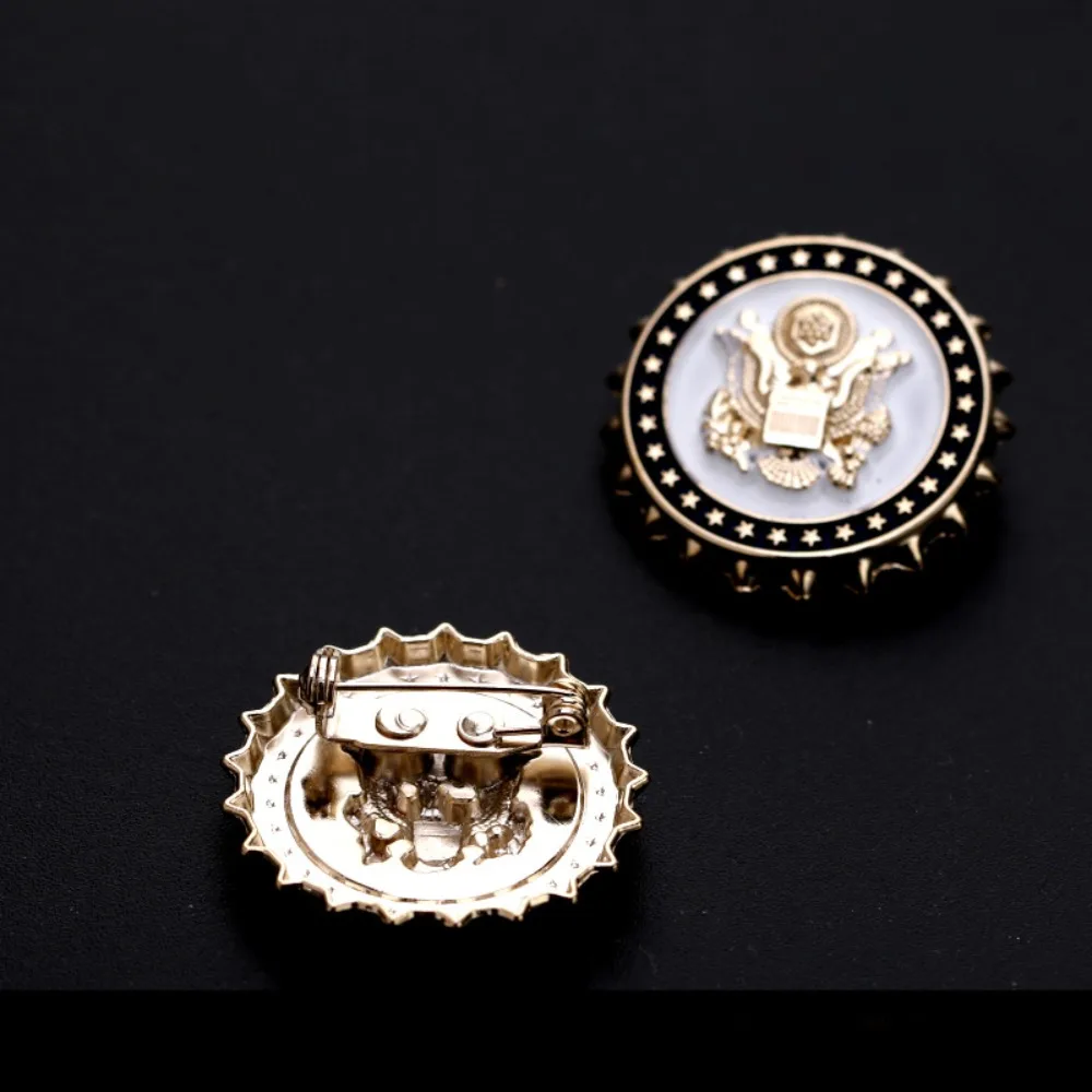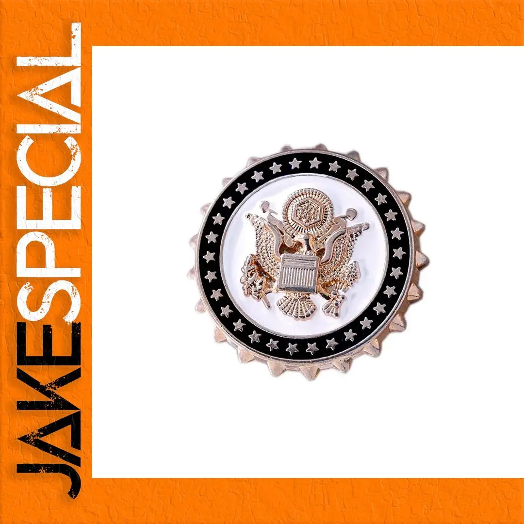 This Classic US Emblem Brooch showcases a unique beer lid badge design, featuring a prominently displayed stylized eagle that symbolizes the U.S. emblem. The intricate details on the shield complement the retro aesthetic of the brooch, while the white circular base and black star-studded ring accentuate its patriotic flair. This shiny golden accessory, crafted from durable alloy metal, appeals to both men and women, making it a versatile addition to jackets, hats, or backpacks. With its charming vintage vibe, it suits a variety of DIY clothing projects.