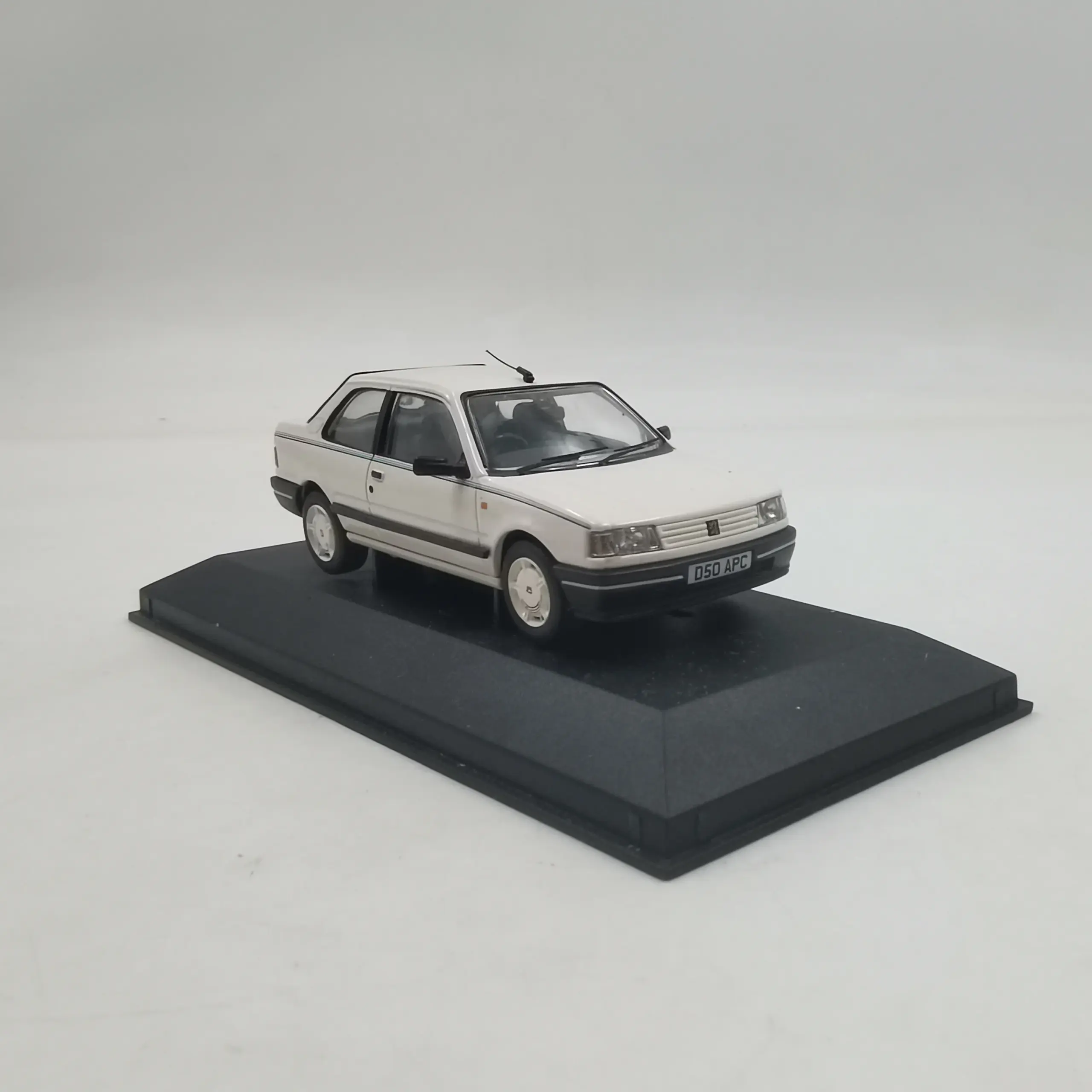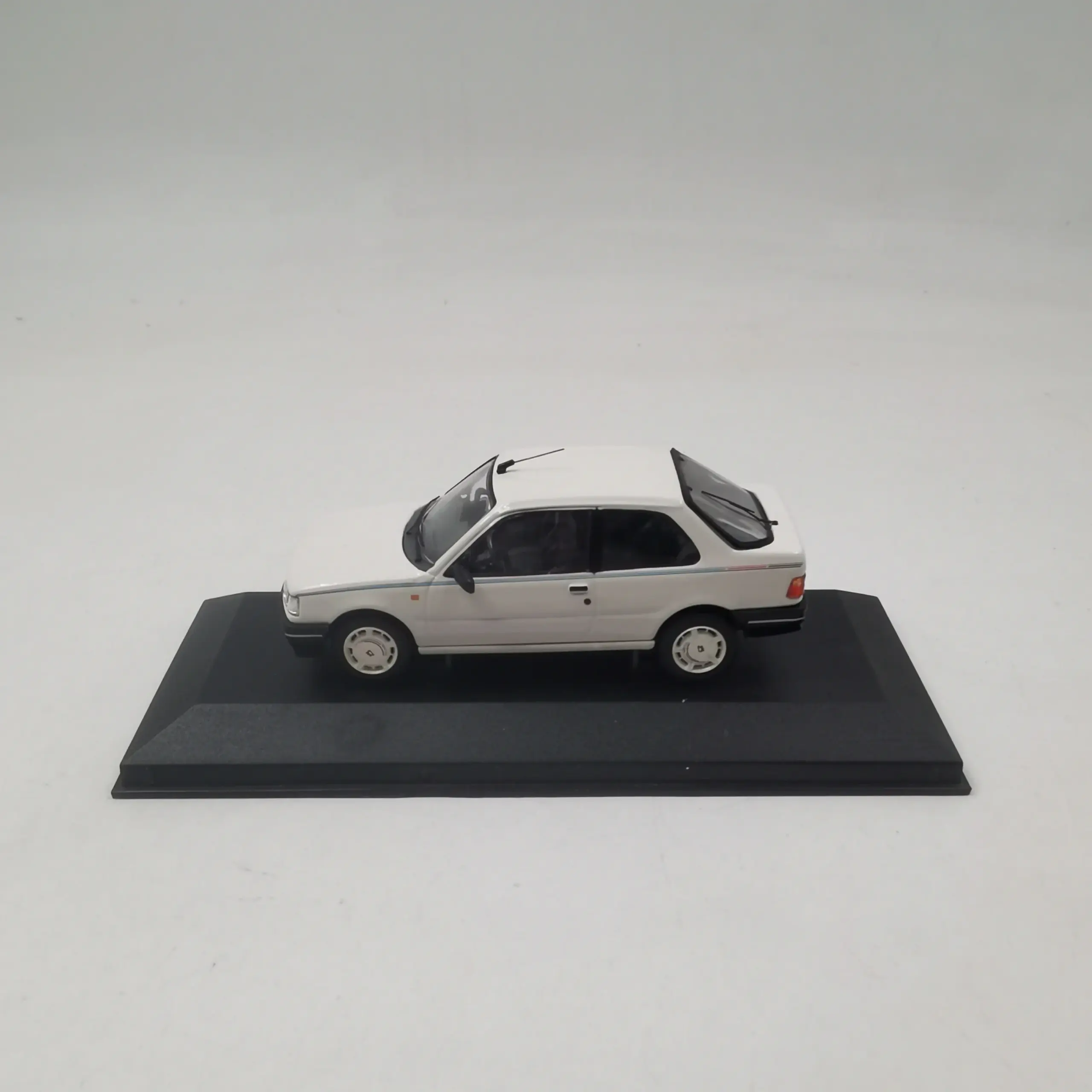 Experience the timeless charm of this beautifully crafted diecast car model, perfect for collectors and enthusiasts alike. With a sleek, white finish, this model captures the essence of a late 20th-century compact sedan, featuring authentic boxy contours and simple detailing. Its sturdy alloy and ABS plastic construction give it a metallic appearance, ensuring longevity and durability. The transparent windows reveal a molded interior, while the front exhibits rectangular headlights and a contrasting black grille and bumper. Sitting on a black display stand, this piece offers an elegant and stable showcase. Whether displayed on your shelf or as part of a collection, this model makes an excellent decorative addition for adult collectors. Small surface paint defects add a touch of authenticity to this vintage-inspired design.
