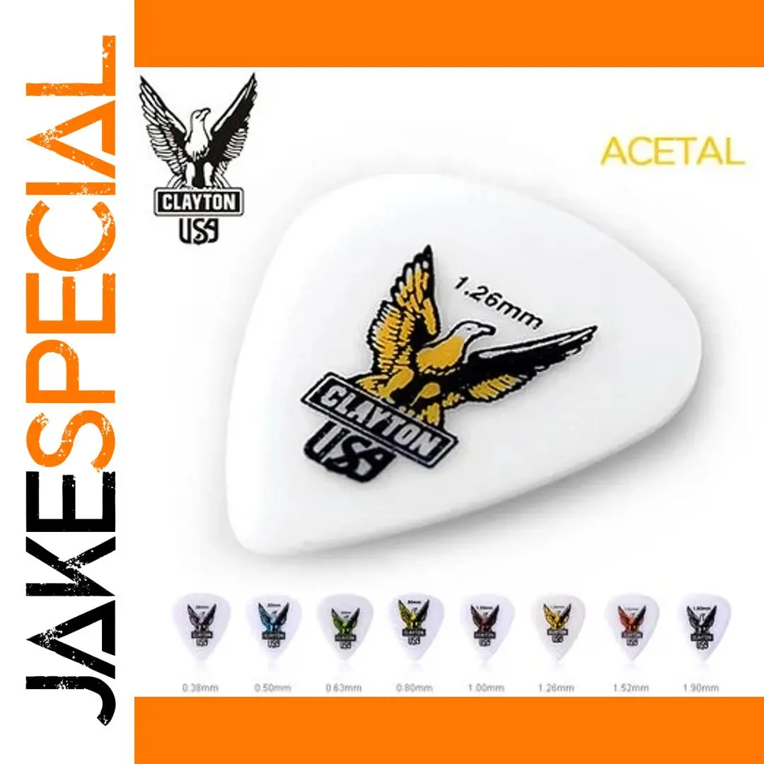 Experience the perfect blend of style and functionality with this Clayton Acetal Guitar Pick. Crafted from high-quality plastic, it offers durability and comfort for every strumming session. The pick features a sleek teardrop shape with a smooth, glossy surface that feels pleasant in your hand, ensuring precise control during play. Its striking visual design showcases a bold yellow and black eagle in flight, set against a white background, making it a standout accessory for guitar enthusiasts. The prominent “CLAYTON USA” logo adds to its authenticity and appeal. Whether you're performing on stage or practicing at home, this pick is designed to inspire confidence and elevate your musical experience. Its versatile size options and eye-catching graphics make it a must-have for passionate guitar players.