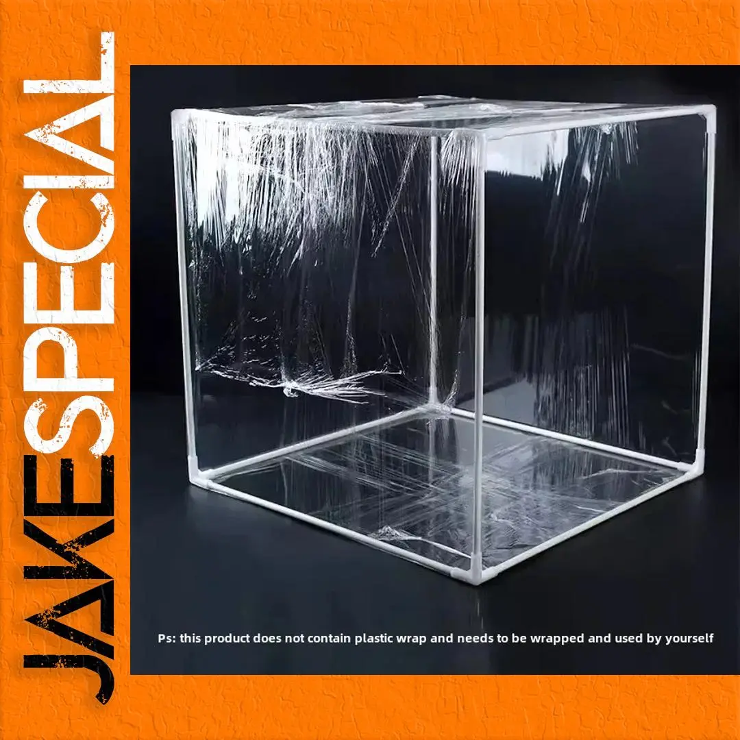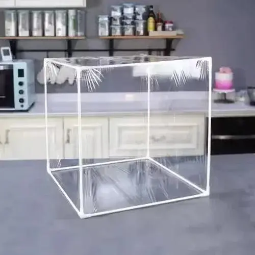 Experience a practical upgrade to your baking and coloring setup with this transparent cubic dust cover. Designed to measure approximately 50×50 centimeters, it offers ample space to shield your work during chocolate, pastry, and coloring tasks. Its sleek, smooth surface ensures easy cleaning while maintaining a minimalist aesthetic. The reinforced white frame contours the edges, providing excellent support and durability. With visible surface scratches and scuffs that tell of its rugged, industrial character, this cover is built for frequent professional use. Its clarity allows you to monitor your work without obstruction, ensuring precision. Whether used in a bakery or for hobby projects, this cover helps maintain a clean, organized workspace by preventing spray splashes and splattering.