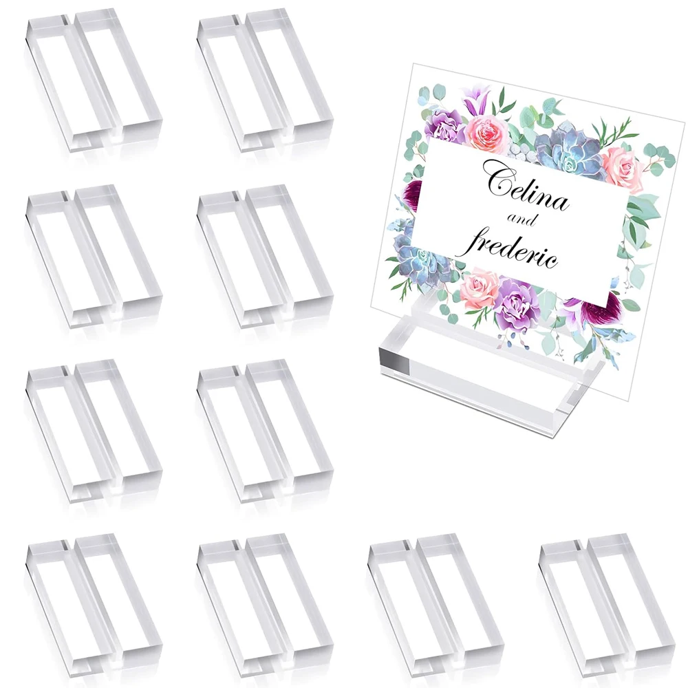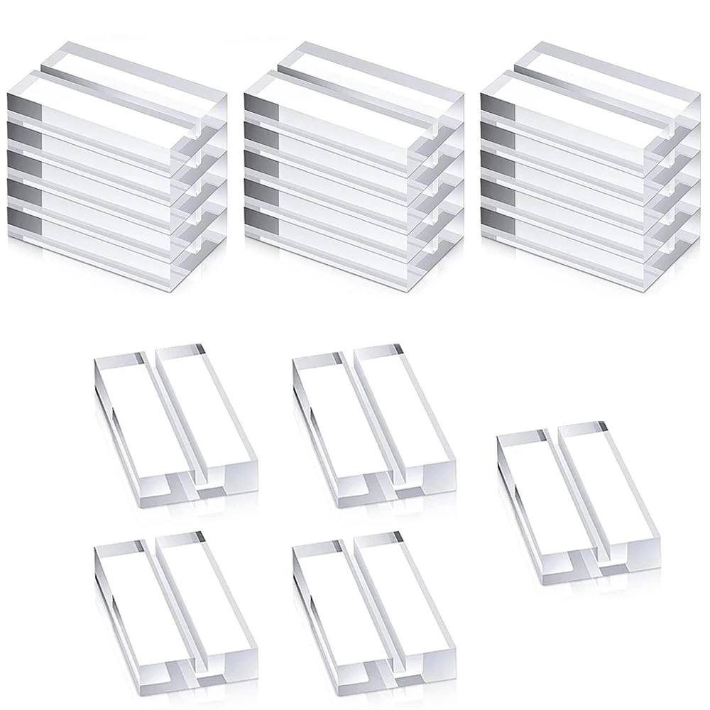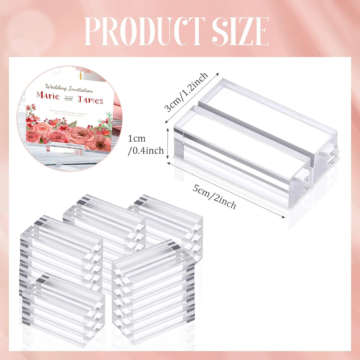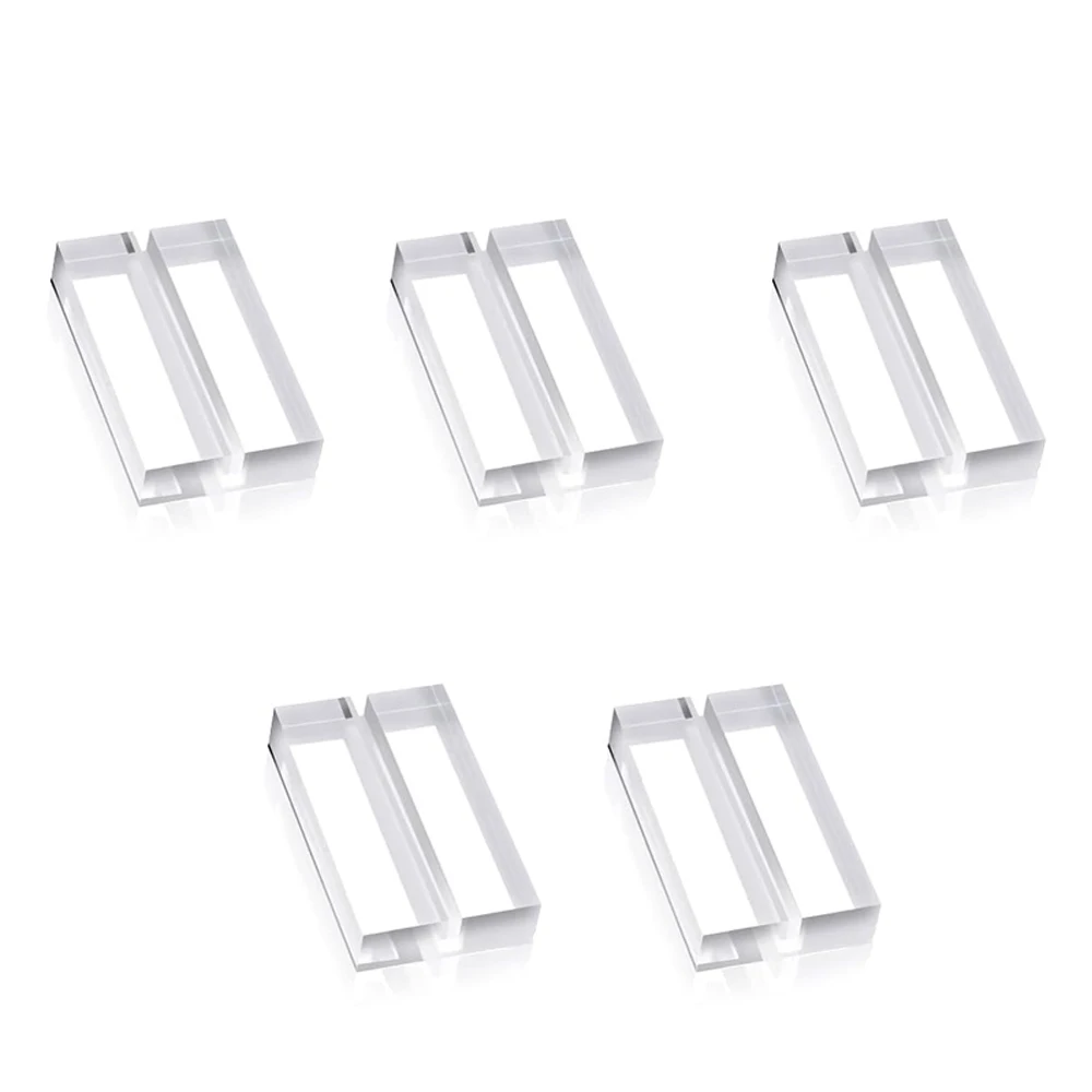 Enhance your events and decor with these sleek, transparent acrylic stands available in packages of 5, 10, or 20 pieces. Measuring approximately 5 cm in length, 3 cm in width, and 1 cm in height, each stand features a slot about 1/8 inch deep and 0.12 inch wide, perfect for holding place cards, table numbers, photos, or name plates. Their minimalist design seamlessly blends into any setting, whether for weddings, parties, offices, or home use, adding an elegant touch while keeping your labels and photos prominently displayed. Crafted from durable acrylic, these supports combine style and functionality effortlessly.