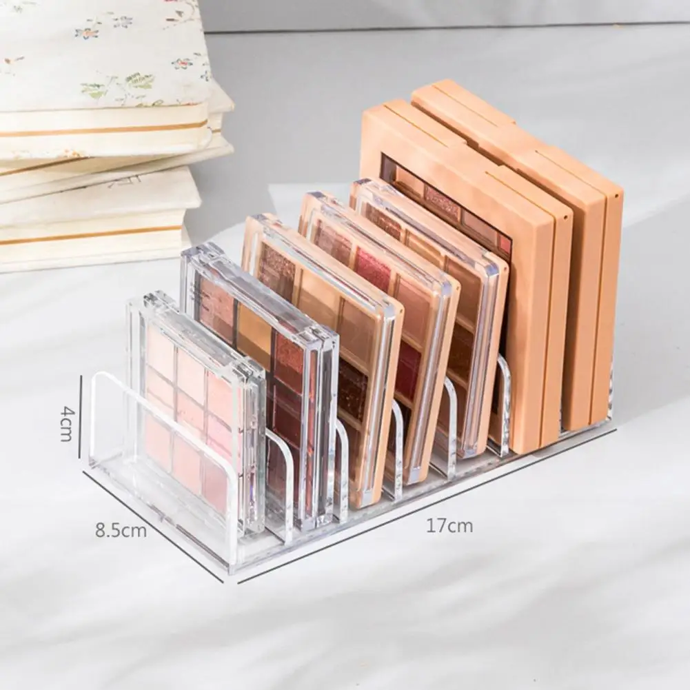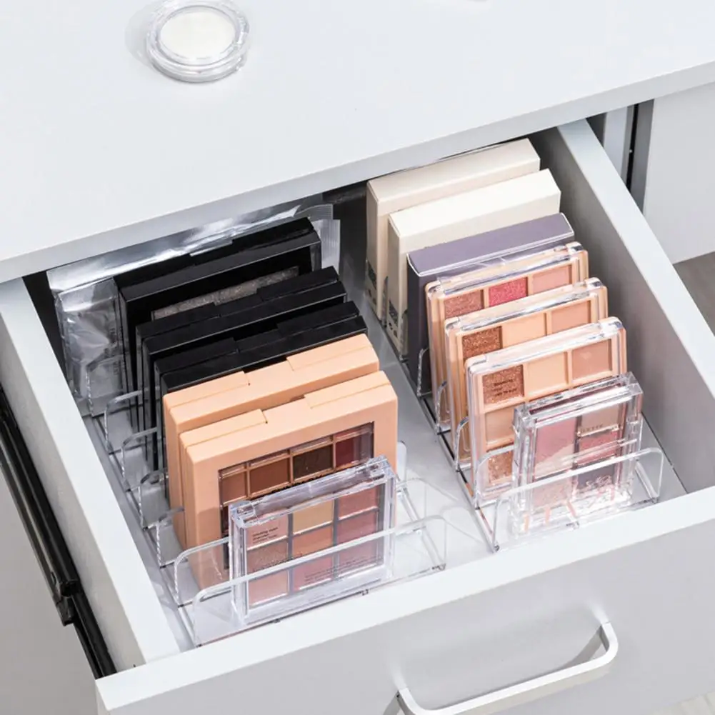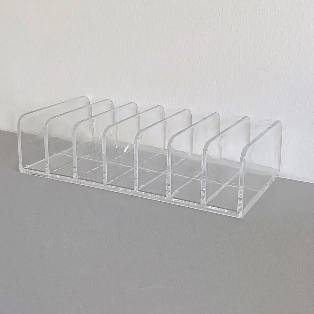Step into a more organized and stylish space with this sleek, clear storage rack designed for makeup lovers. Its modern, minimalist design made from heavy-duty PS material offers durability and transparency, making it easy to see and access your favorite eyeshadow palettes, small cosmetics, cash, or cards. The rack features seven compartments, including one larger section ideal for lipsticks or larger items, and six smaller compartments perfect for eyeshadow palettes or small accessories. Its rectangular shape and transparent finish bring a clean, professional look to your vanity or office. Imagine effortlessly finding your items, with everything neatly stored and visible at a glance, saving you time and stress while elevating your décor.
