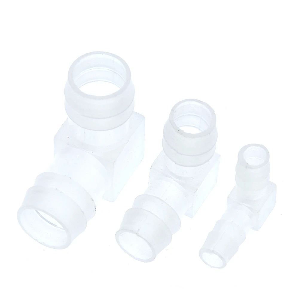 - The connectors feature a right-angle L-shape, with ridged, textured barbed ends at both ends, offering a tight fit and leak-proof hold with hoses of matching sizes.