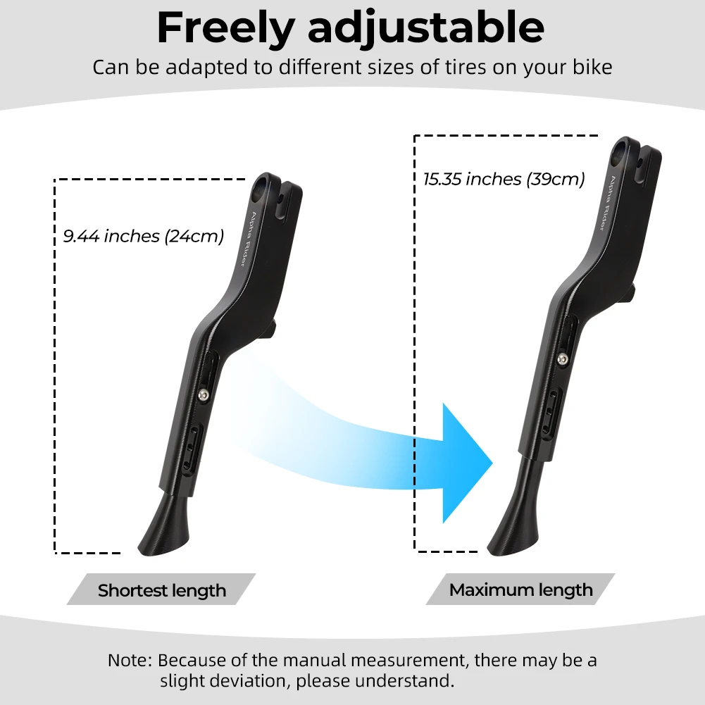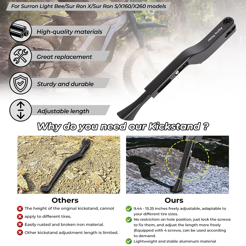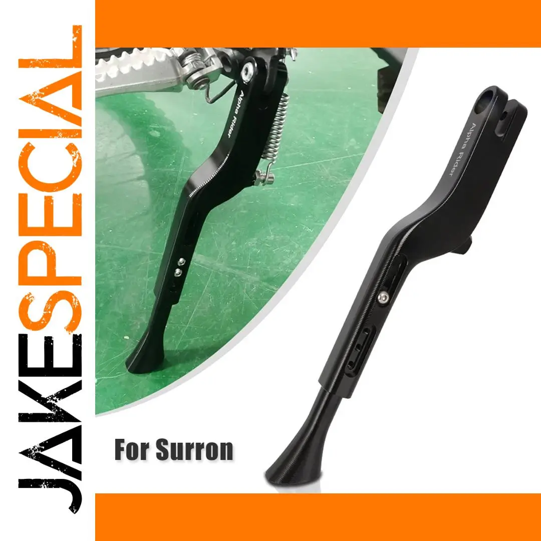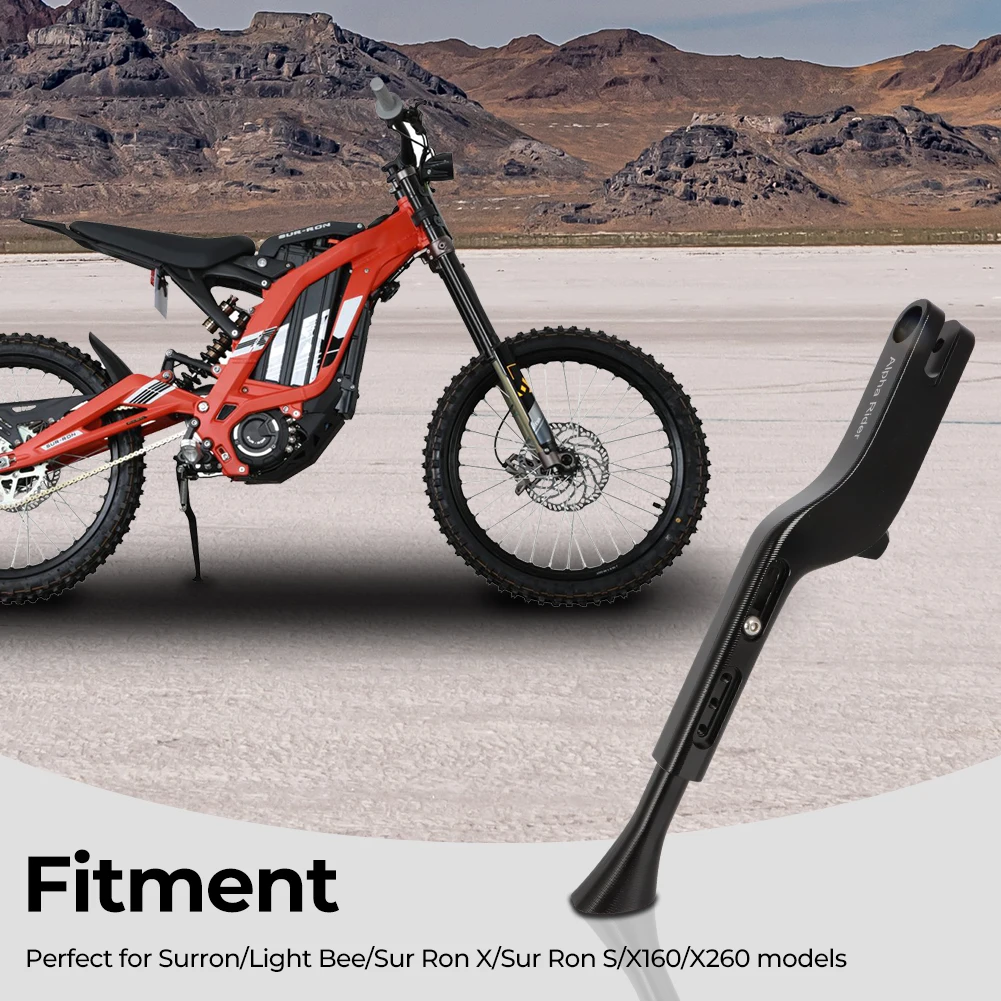Enhance your electric dirt bike with this black CNC aluminum alloy kickstand, weighing only 0.6 kg, designed for durability and precision. Compatible with Light Bee, Surron, Sur-Ron, Sur Ron X, Sur Ron S, X160, and X260 models, it features an adjustable height range from 26.5 cm to 35 cm, with a standard height of 31 cm to fit various tire sizes securely. The kit includes the main kickstand, screws, spring, and a hexagonal spanner for easy installation. Its sleek, modern design combines robustness with a lightweight structure, providing a reliable support leg for stable parking and confident riding.