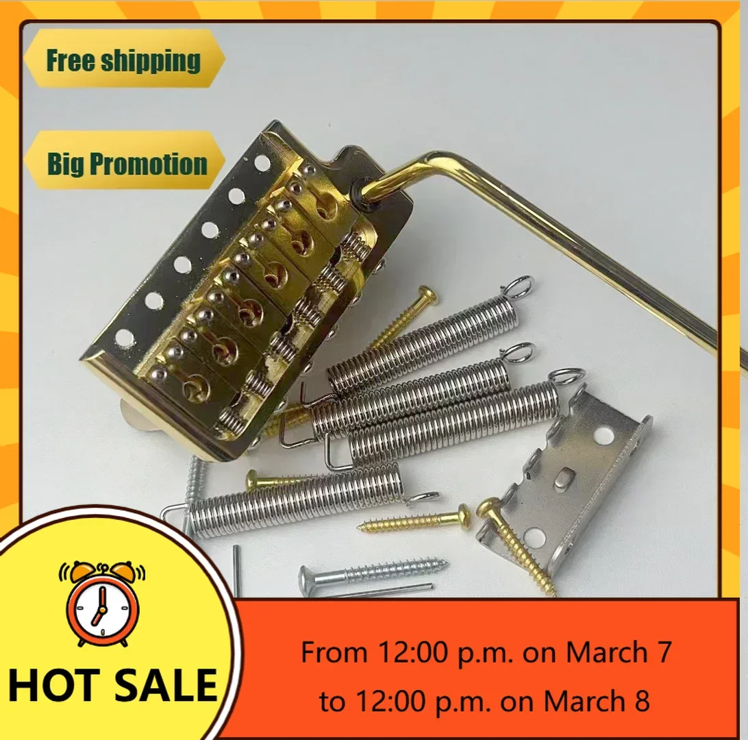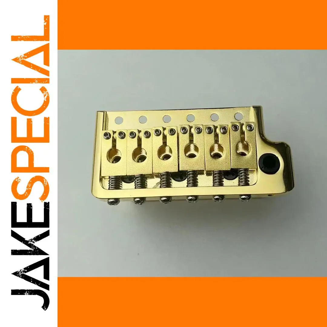 Experience unmatched tone and style with this premium CNC machined ultra brass guitar tremolo bridge. Designed for guitar enthusiasts who demand quality, its luxurious gold-colored finish adds an elegant touch to your instrument. Crafted from full solid brass and complemented by a stainless steel plate, this bridge offers superb durability and precise tuning stability. The six saddles, meticulously aligned in a straight row, feature adjustable screws and small string holes, making setup a breeze. The rectangular baseplate boasts a shiny, polished surface with beautifully curved edges for a modern aesthetic. The included 5mm press-in stainless steel tremolo arm fits perfectly, ensuring smooth operation. Suitable for many Mexico and Asian-made Strat-style guitars with a 52.5mm string spacing, this bridge enhances both your guitar's sound and appearance.