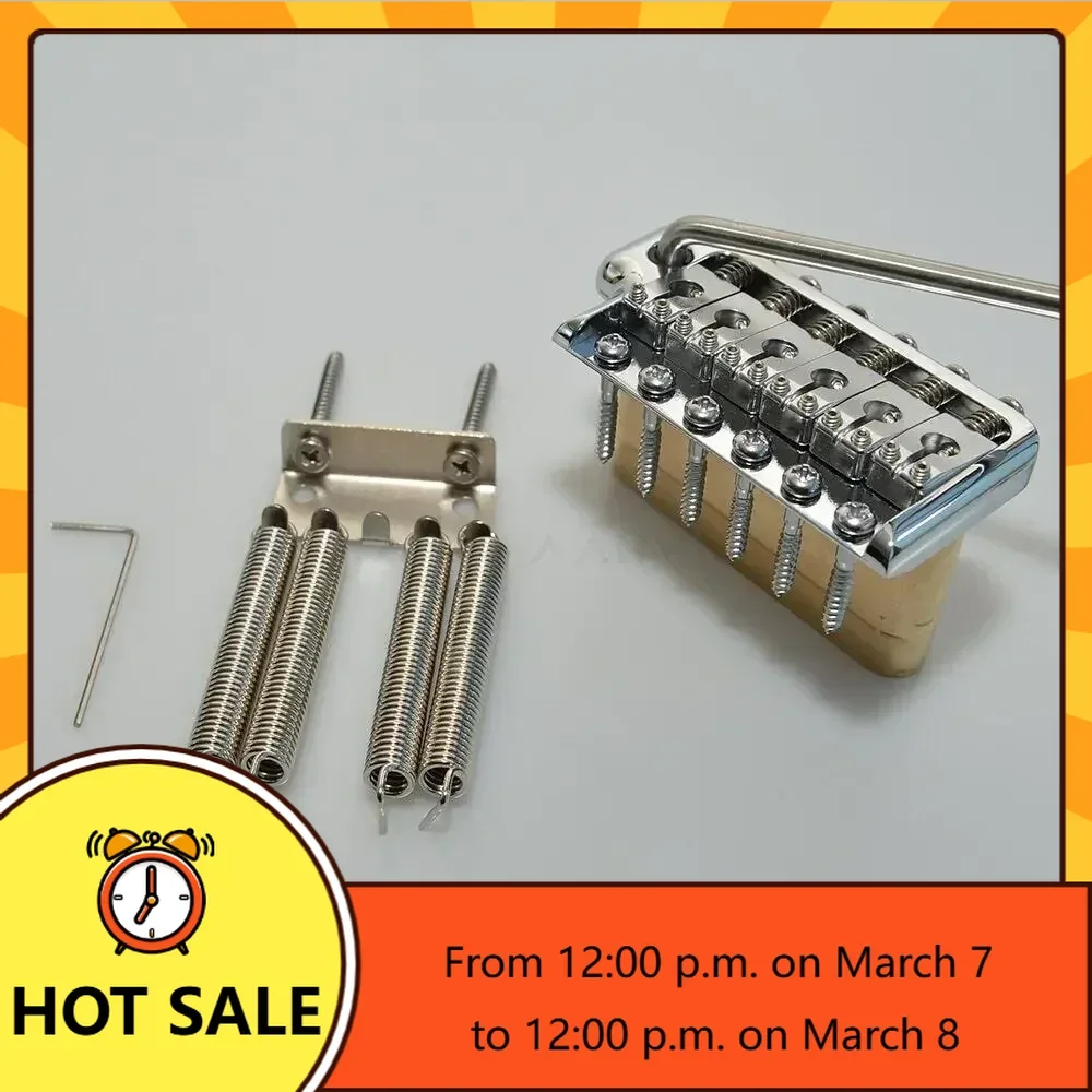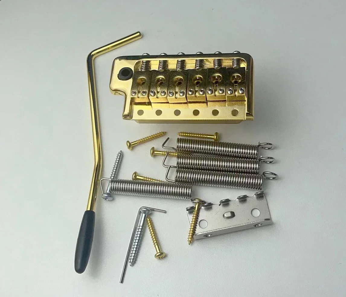- The package includes all essential components: one brass bridge, stainless steel tremolo arm, six mounting screws, a claw with two screws, four tremolo springs, and a wrench for easy installation and adjustment.
