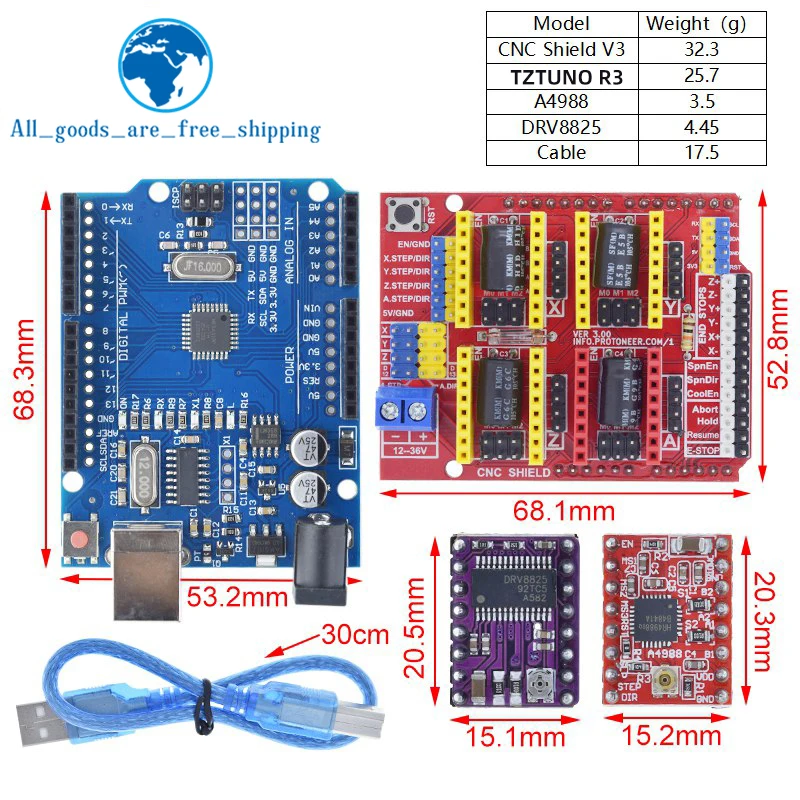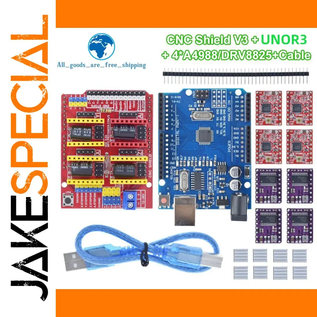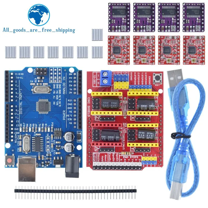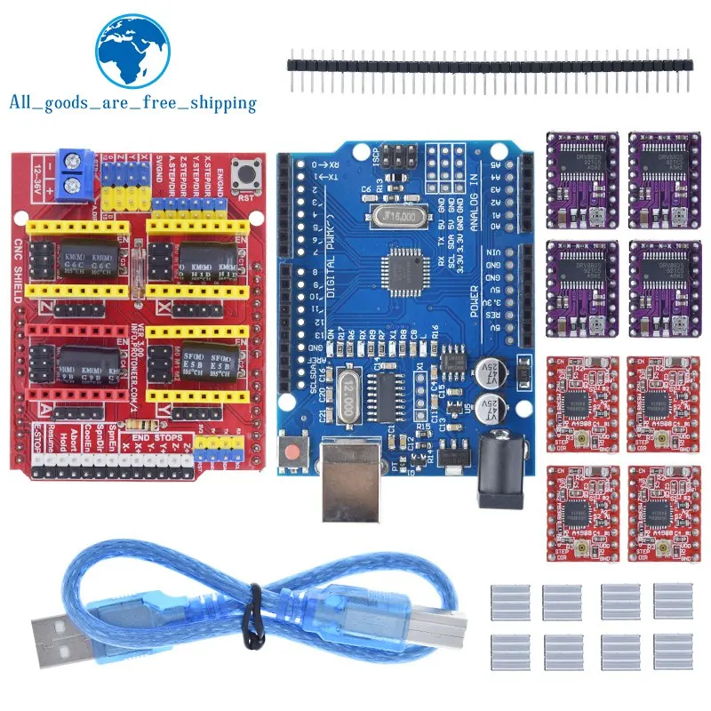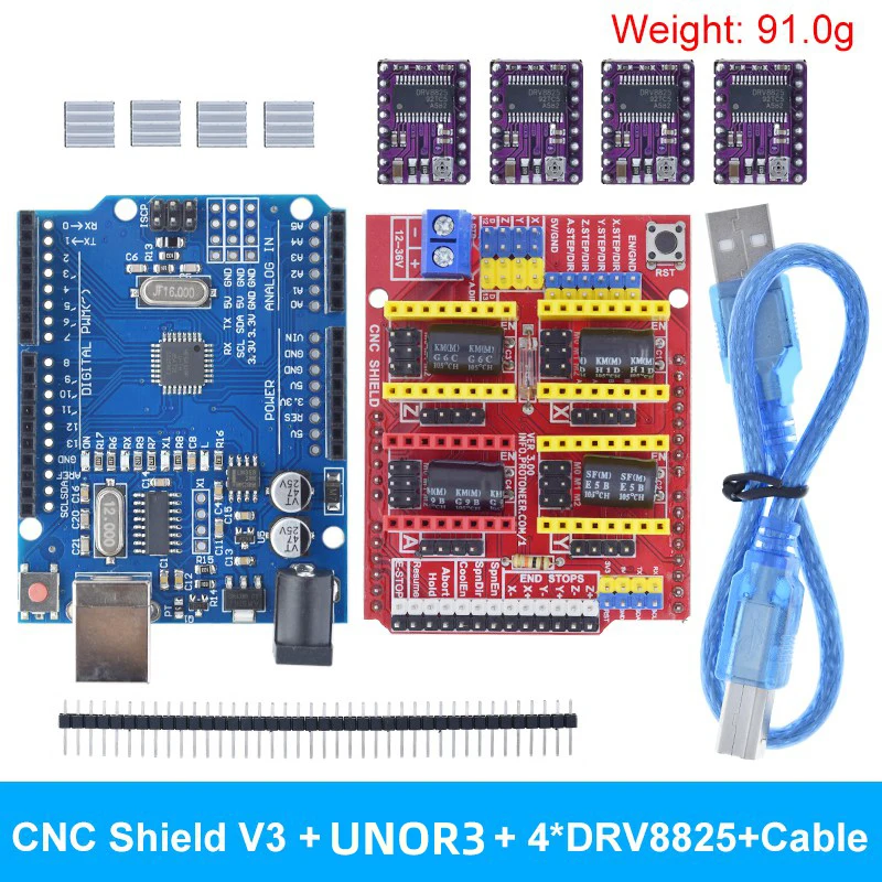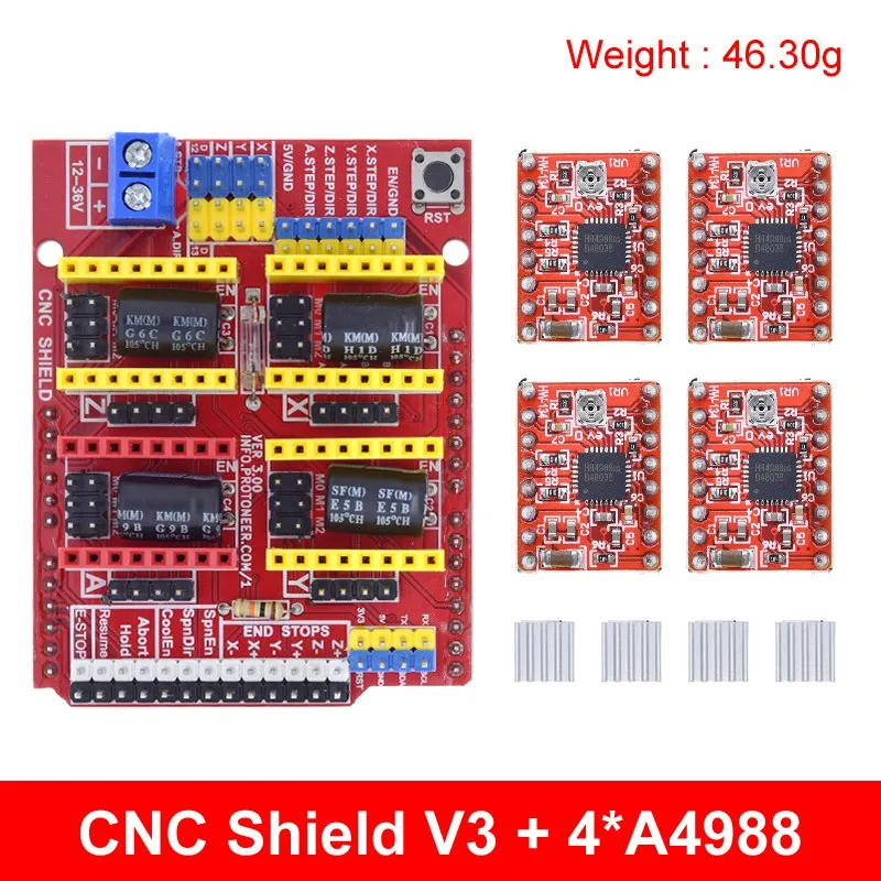 Enhance your engraving machine or 3D printer with this versatile CNC Shield V3 DIY kit featuring a sleek blue rectangular circuit board with clearly labeled pin headers and interfaces. Compatible with both DRV8825 and A4988 drivers, it offers four driver slots, a wide operating temperature range of -40°C to +85°C, and functions as a voltage regulator for customizable power options. The kit includes a handy USB cable for easy connectivity and promotes a modular, organized setup ideal for sensor and switch integration in STM applications. Perfect for DIY enthusiasts looking to upgrade or build precise, reliable electronic control systems for their creative projects.