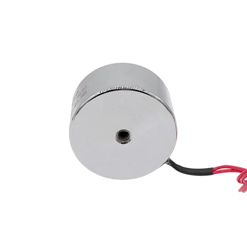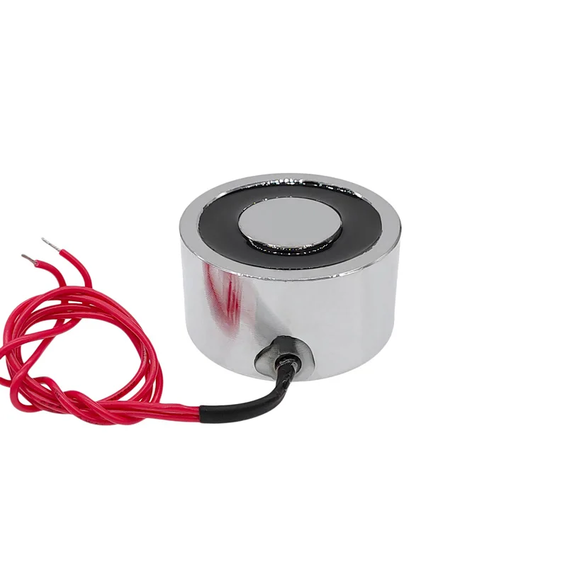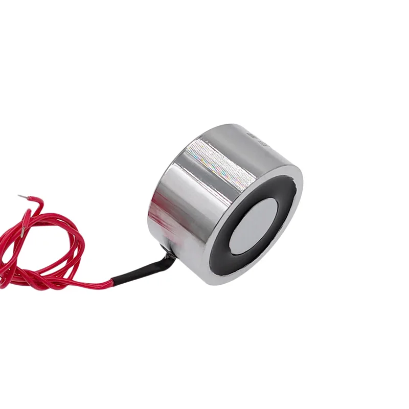 Experience reliable magnetic holding with this sleek, cylindrical solenoid electromagnet featuring a 50mm diameter and 27mm thickness. Designed for intermittent use, it operates at 12V DC or 24V DC, delivering a powerful 55 kg (550 N) holding force when in direct contact with a smooth, flat, and clean surface. Its polished metallic finish, rounded edges, and minimalist design combine durability with industrial style. Thin, insulated red and black wires extend from the compact coil, emphasizing its technical precision. Perfect for lifting and securing applications, this electromagnet offers a high-quality, efficient solution for precise magnetic contact in various industrial environments.