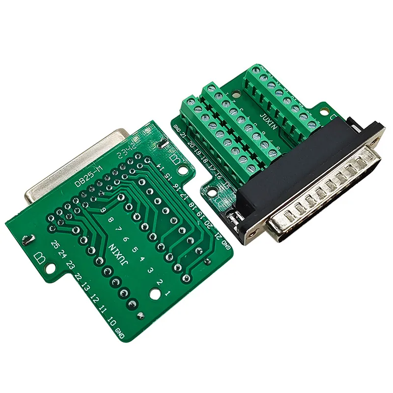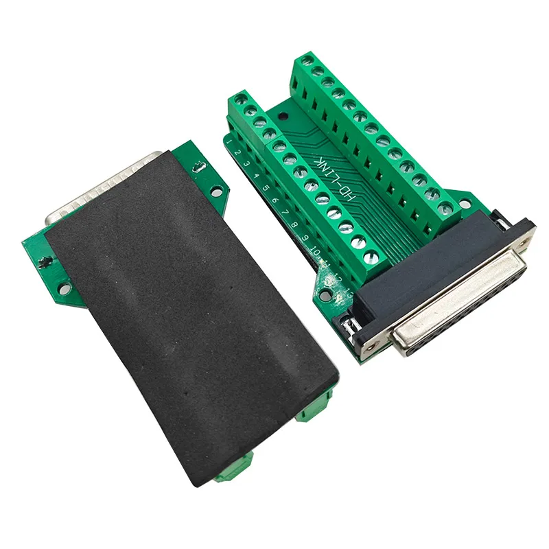 - Green terminal blocks with screw clamps offer secure, solderless wiring for serial and parallel interfaces.