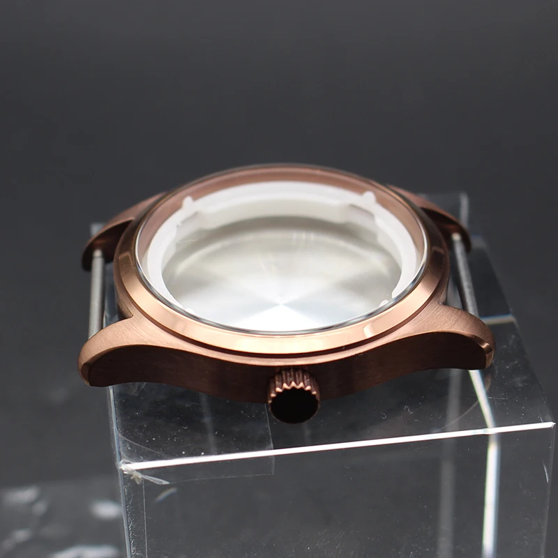 Experience the perfect blend of durability and style with this coffee-colored, 40mm pilot watch case. Crafted from solid 316L stainless steel, it features a brushed matte finish that highlights its high-quality metallic texture. The compact 12.3mm thickness enhances its sleek profile, while the integrated, smoothly curved lugs provide a seamless, refined silhouette. Designed to fit dial sizes between 33.6mm and 34.3mm, this case is compatible with several reliable movements including NH34, NH35, NH36, NH38, and 4R36, making it versatile for various builds. The saltwater-resistant design allows immersion up to 100 meters (10 ATM), ideal for aquatic adventures. Its screw-in crown, mineral glass, and robust construction make it perfect for pilots or enthusiasts seeking a classic yet modern aesthetic.