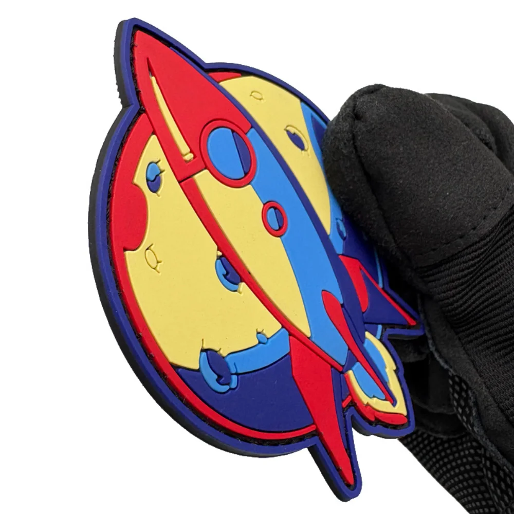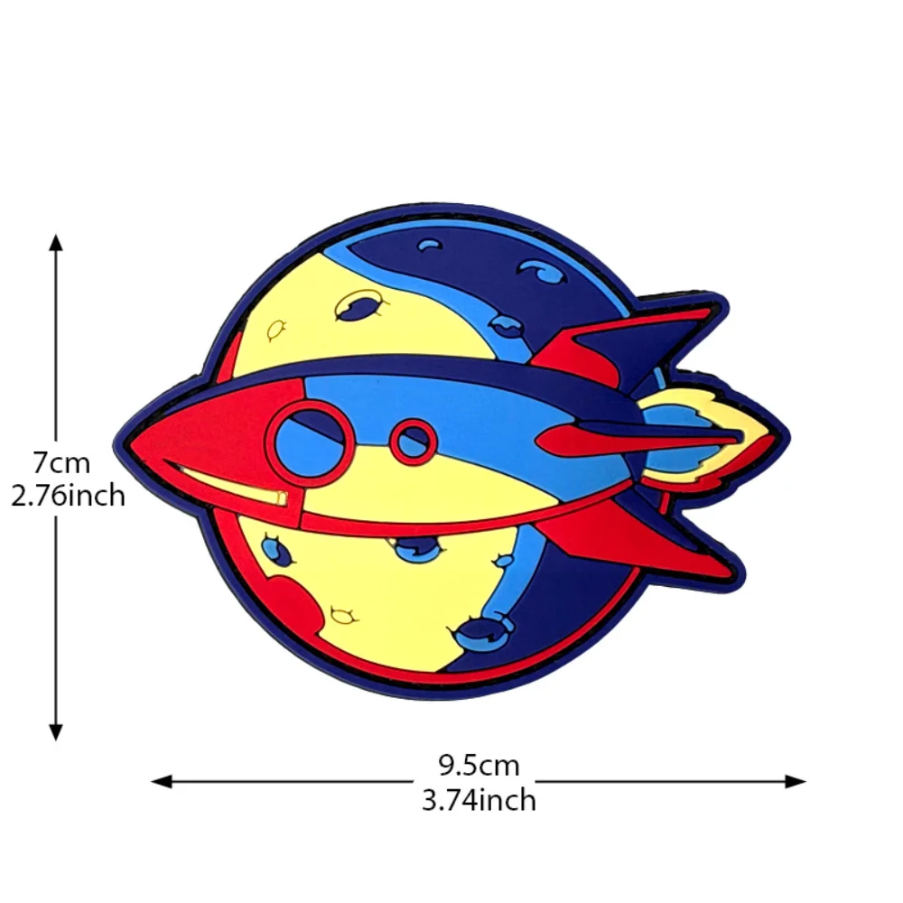 Imagine adding a vibrant, playful touch to your clothing or gear with this lively space-themed badge. Designed with bright, vivid colors, it features a sleek cartoon rocket ship in bold red with blue accents, flying across a vibrant yellow planet dotted with dark blue craters. The raised PVC material creates a textured, three-dimensional effect that brings the design to life, while smooth, sharp edges enhance its fun, cartoonish aesthetic. Suitable for decorating jackets, backpacks, hats, and helmets, this patch adds a whimsical space vibe to any item. Its hook-and-loop backing offers quick attachment and removal, making it perfect for customizing your belongings effortlessly. You’ll love how this accessory elevates your style and expresses your love for space adventures.