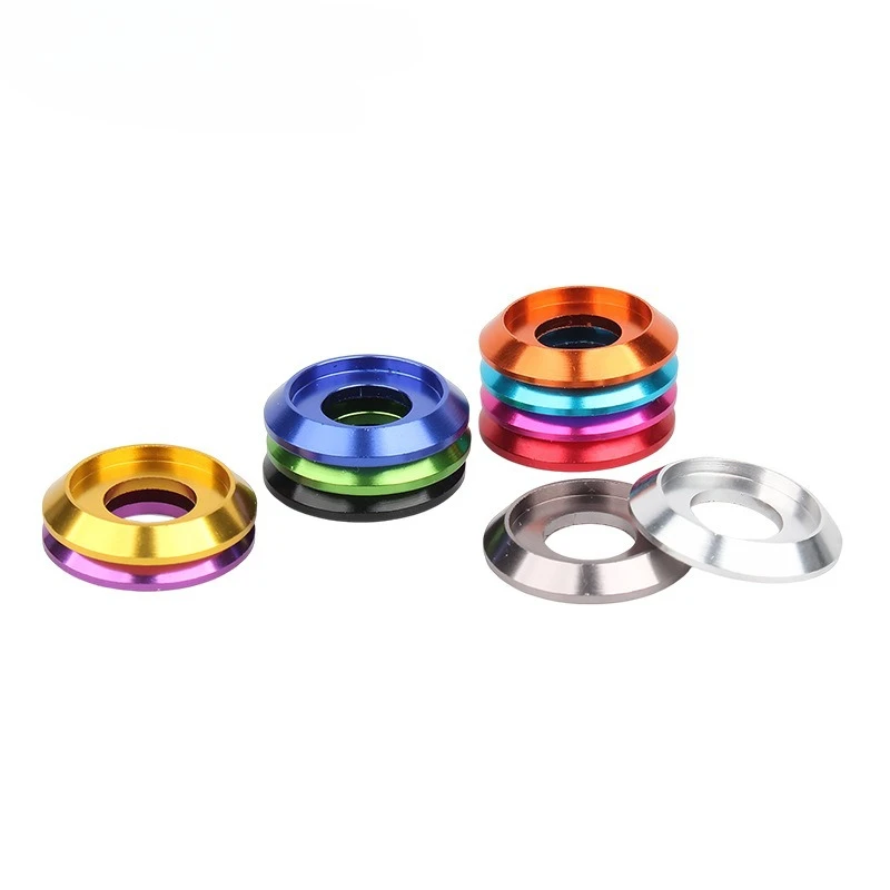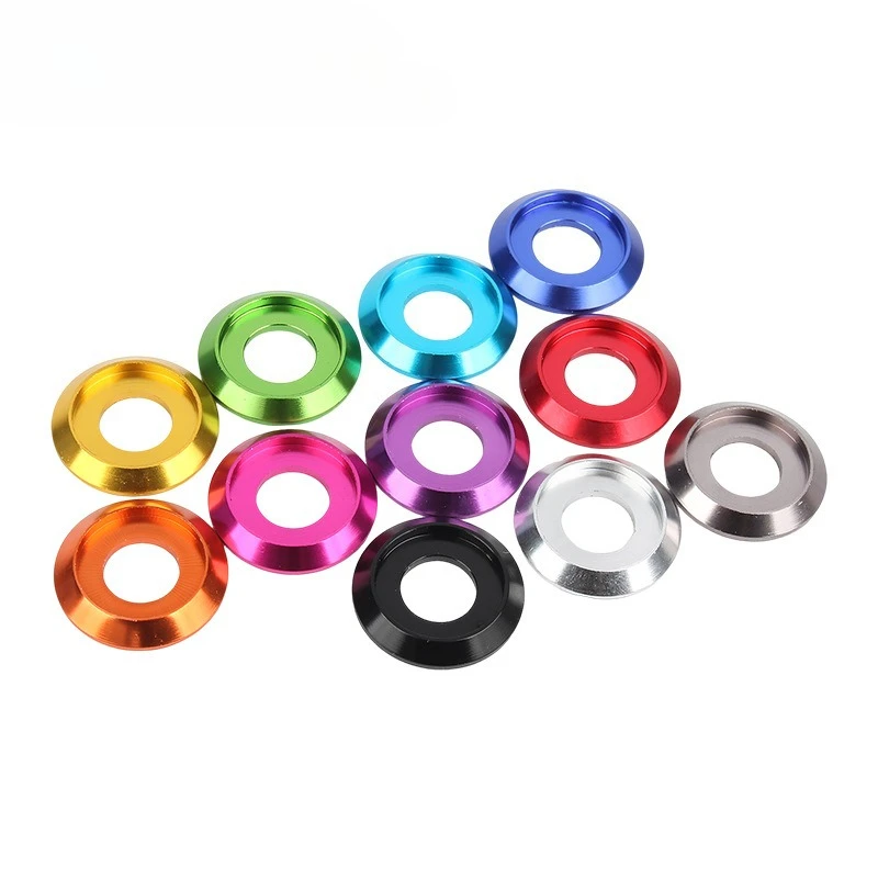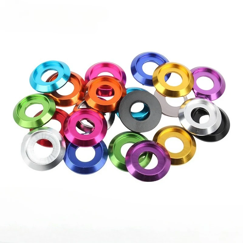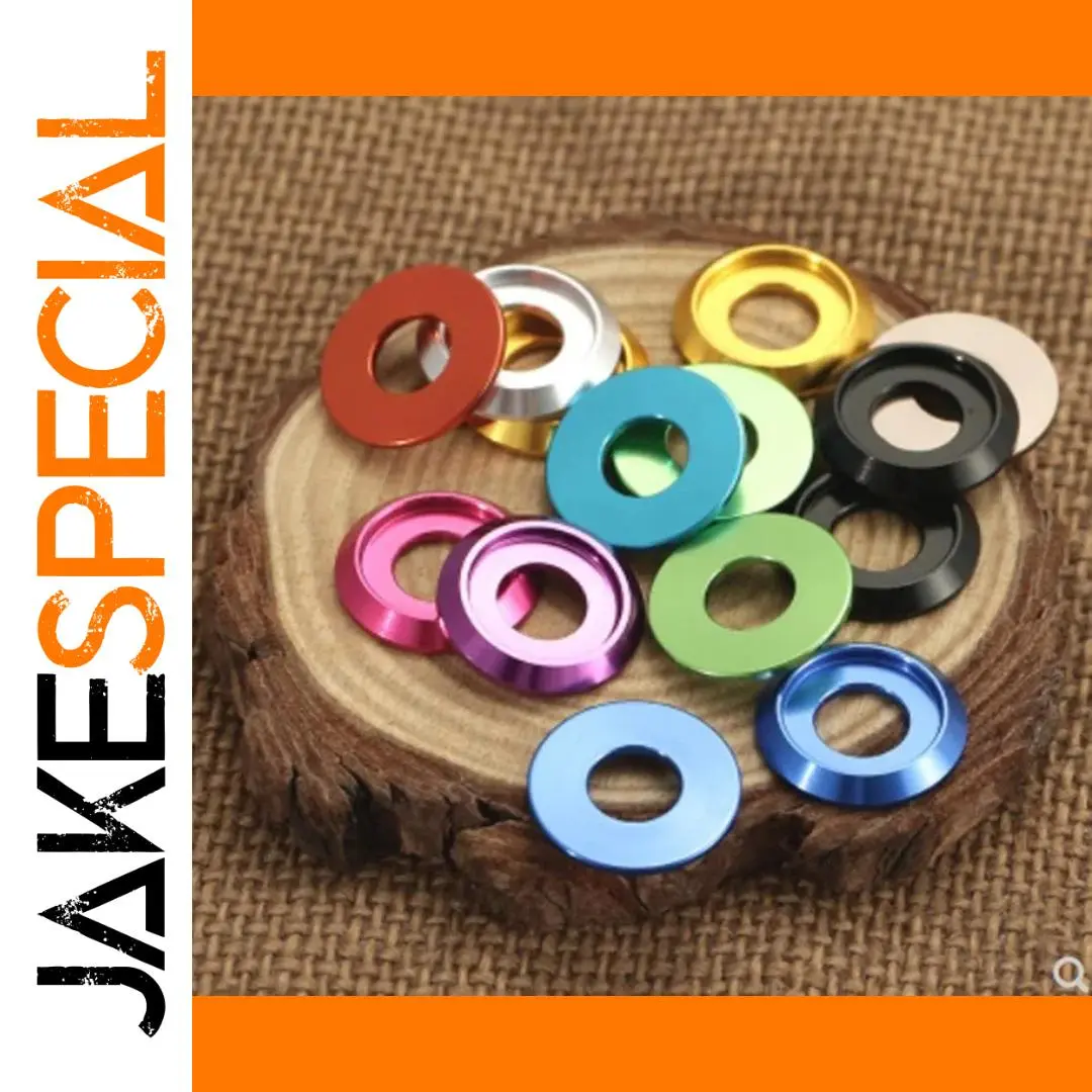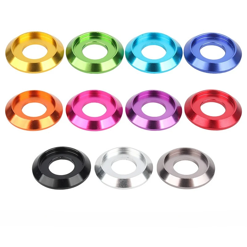 Transform your projects with this set of ten vibrant aluminum cup head washers, designed to meet your fastening needs with style. Each washer features a smooth, anodized finish that offers durability, corrosion resistance, and a glossy, reflective surface. Available in an array of eye-catching colors such as red, blue, green, yellow, pink, purple, black, silver, gold, orange, and dark blue, these washers add a splash of personality to your assembly. Their round shape with a central hole and slightly protruding cup head combine functionality with eye appeal. Perfectly suitable for use with button head screws and bolts across various metalworking applications, these washers enhance both the aesthetic and performance of your projects. Their customizable, sleek design makes them ideal for decorative and functional uses alike.