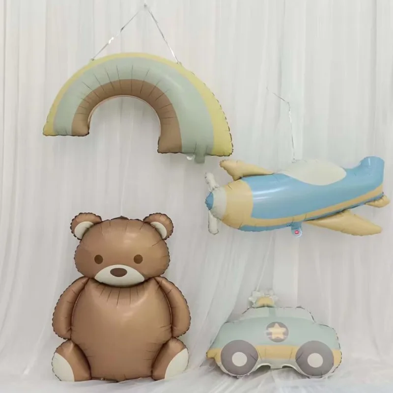 Imagine transforming your celebration into a whimsical wonderland with this charming selection of foil balloons. Crafted from high-quality aluminum film, these balloons feature adorable designs inspired by cartoon animals and vehicles, including playful bears, vibrant airplanes, colorful cars, and enchanting rainbows. Their soft pastel palette in shades of yellow, green, blue, beige, brown, pink, and cream adds a gentle, cheerful atmosphere. Available in various sizes, such as 89×65 cm, 56×50 cm, 78×42 cm, 81×44 cm, and 56×95 cm, they are perfect for creating eye-catching decorations. These balloons are easy to float and hang thanks to bottom holes, and they can be used repeatedly after deflation, making them practical and fun.