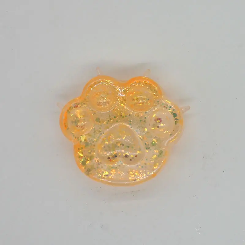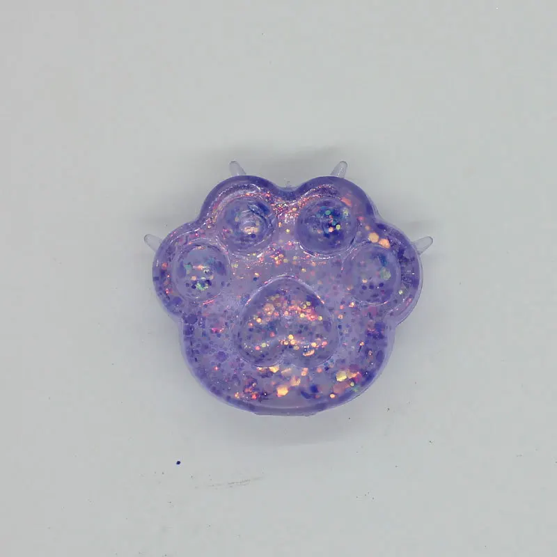 Imagine easing your daily tension with this vibrant, playful stress relief toy. Crafted from soft, translucent TPR material, it offers a satisfying squeeze with slow rebound elasticity. The eye-catching design features a rounded paw print with five distinct toes, each slightly raised for tactile pleasure. Embedded sequins and tiny glitter particles catch the light, creating a shimmering effect in colors like light orange with a golden shimmer, bright pink sparkling iridescence, light purple with glitter accents, and glossy light blue with a glittery finish. Edged with small spikes, the toy adds grip and style. Compact and durable, it’s perfect for stress relief, decompression, or simply adding a colorful, tactile accessory to your routine.