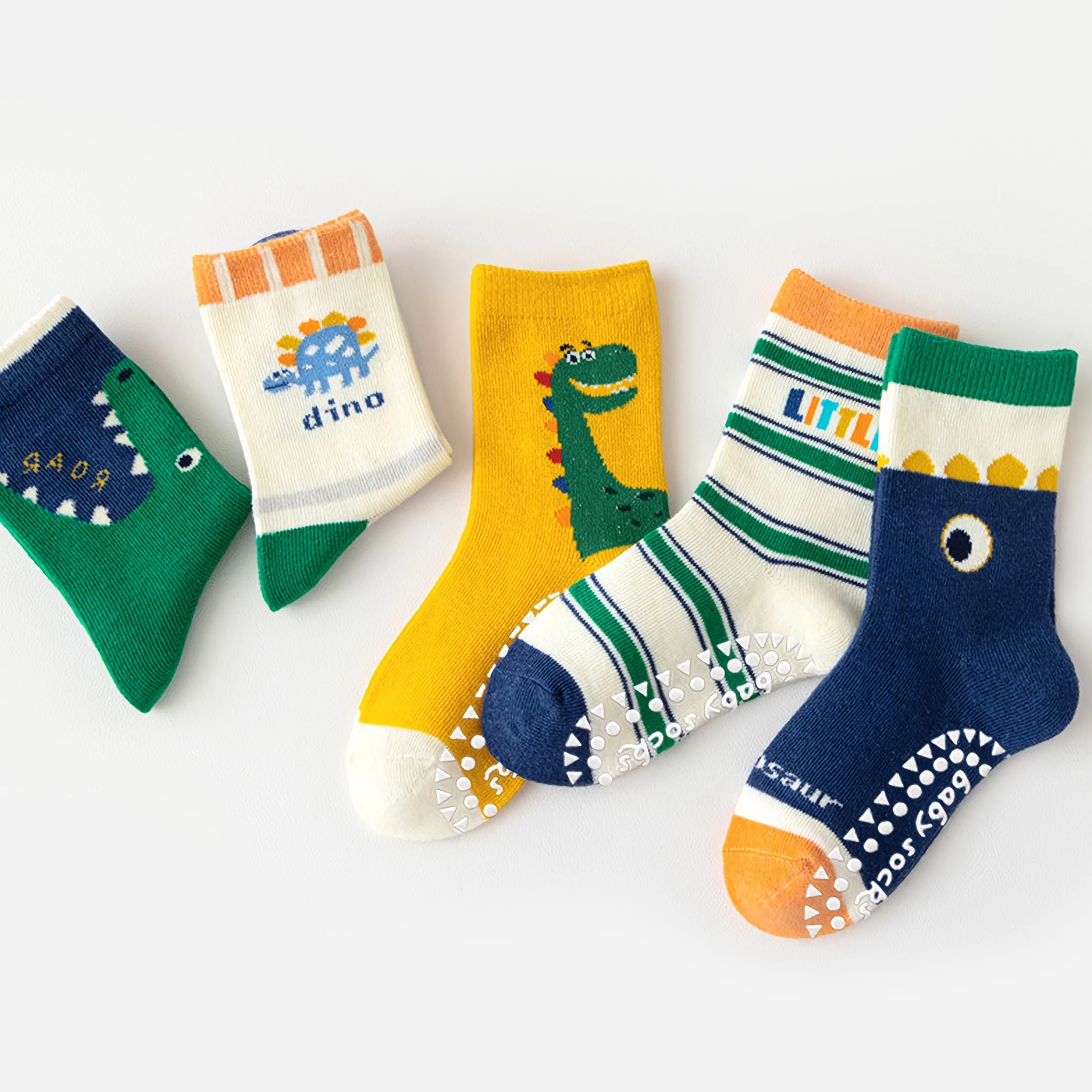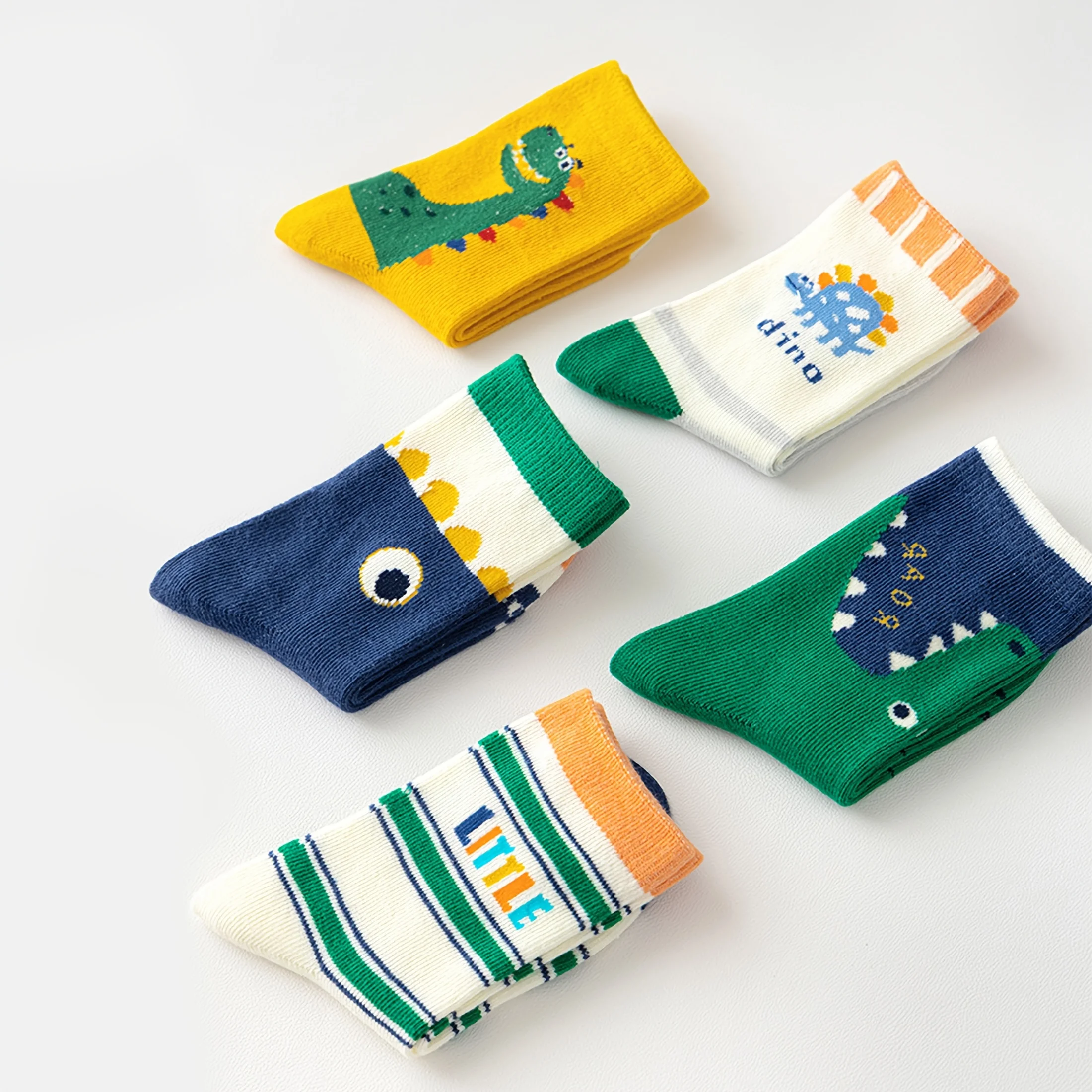 - Set of five pairs of colorful, cartoon dinosaur socks for kids, available in sizes 1-3, 3-5, 5-8, and 8-12 years old, perfect for all seasons and daily wear.