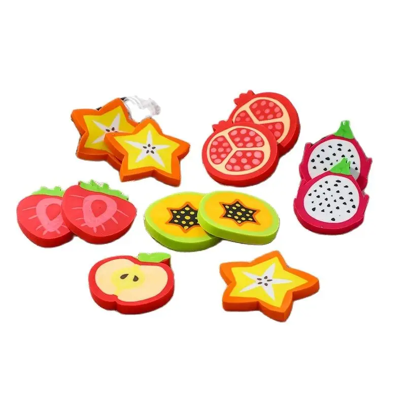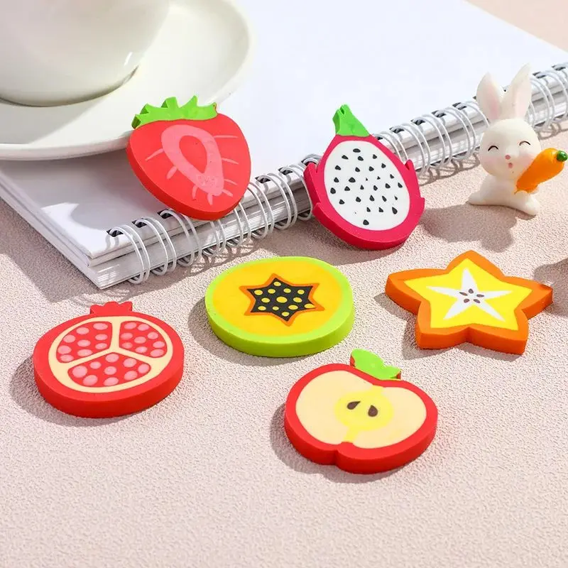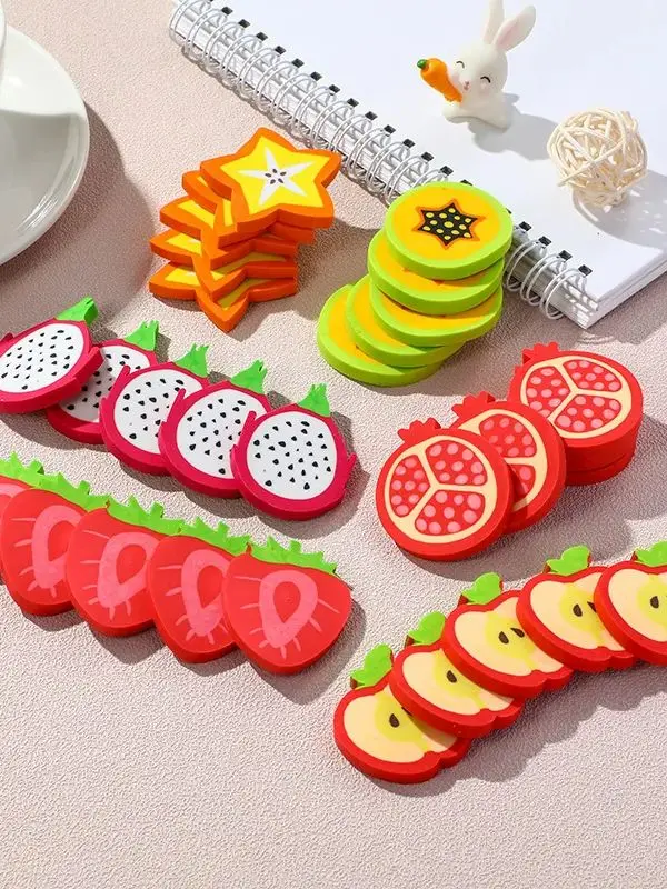- Includes six rubber erasers designed as apple, papaya, strawberry, dragon fruit, pomegranate, and carambola for a colorful, realistic look.