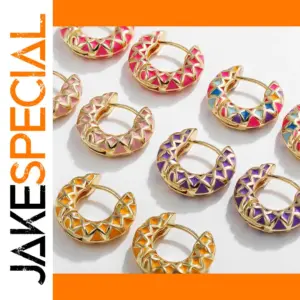 Imagine elevating your style with these fashionable, colorful enamel hoop earrings. Their bold, geometric round design with hollow centers instantly adds a modern, punk-inspired touch to any look. Crafted from copper alloy metal with a shiny gold-tone finish, these earrings feature vibrant enamel accents in multicolor, pink, yellow, or rose hues, filling playful triangular and arrow-shaped cutouts. Perfect for pierced ears, they are lightweight yet chunky, making a statement without sacrificing comfort. Their trendy style emphasizes a fun and assertive personality, ideal for those who love to express bold fashion choices. Whether for a casual day or an edge-enhanced night out, these earrings are designed to catch eyes and turn heads.
