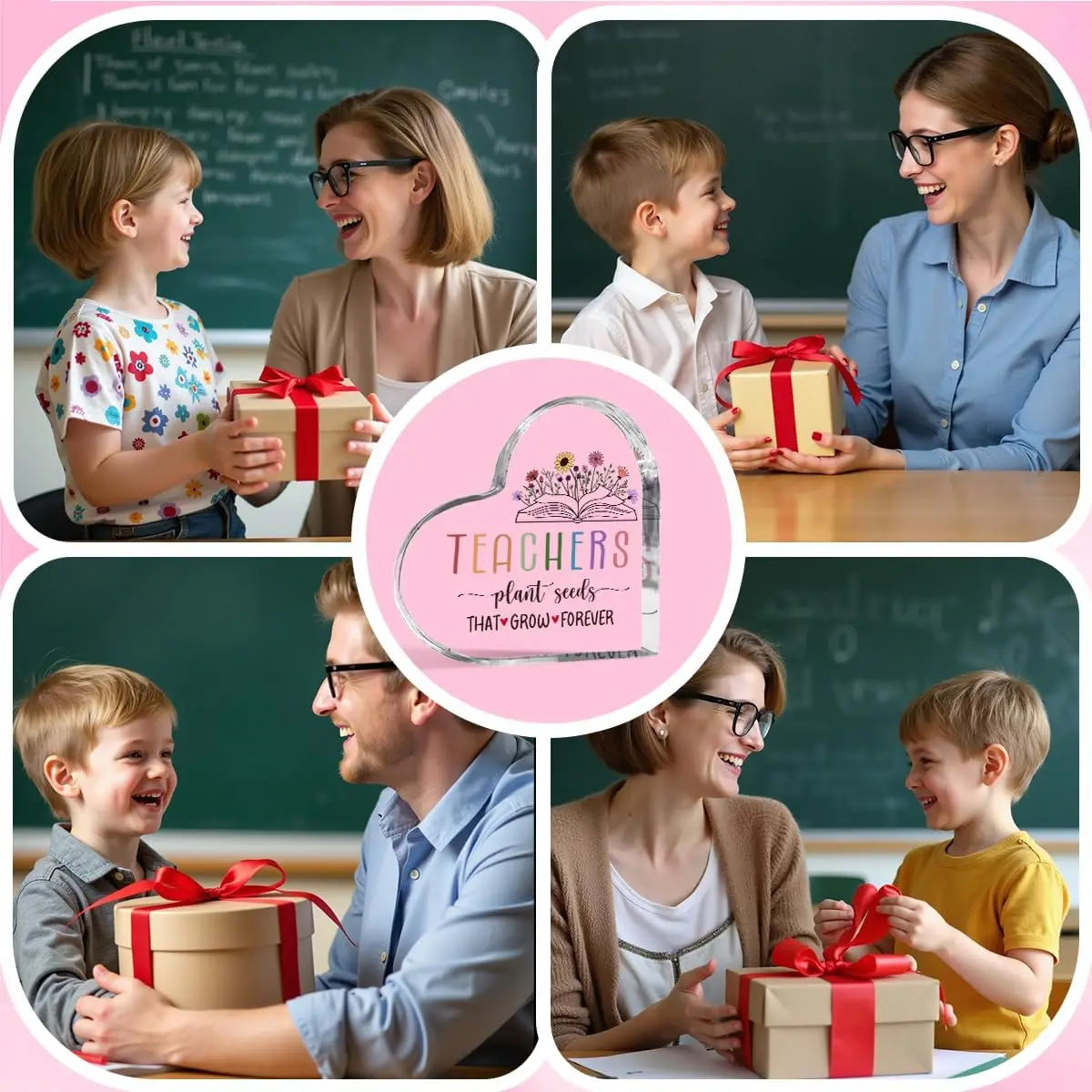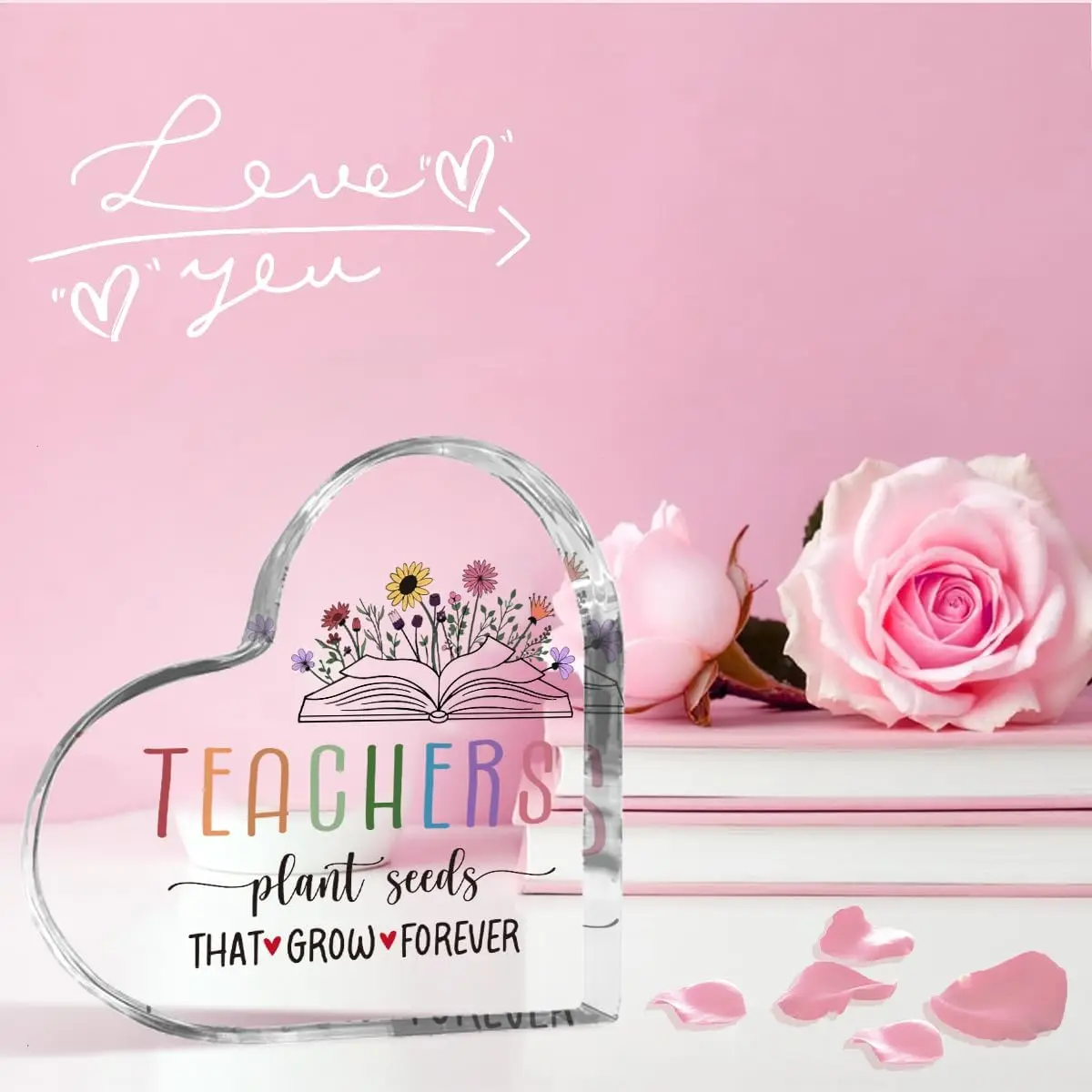 Celebrate teachers with this vibrant, heart-shaped desk decor made of smooth, glossy plastic. Featuring a cheerful design with multicolored uppercase letters spelling “TEACHERS,” an illustration of an open book with colorful flowers, and decorative red hearts, it exudes positivity and appreciation. The handwritten-style script adds a heartfelt touch, making it an ideal gift or office decor for both women and men teachers. Measuring approximately 1 piece per unit, this non-chemical, durable accessory is perfect for brightening up any workspace or gift-giving occasion, creating a warm and trusting connection that honors the dedication of every teacher.