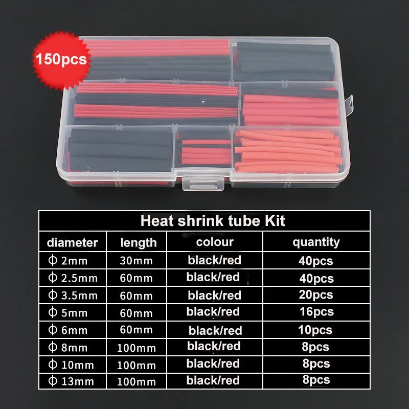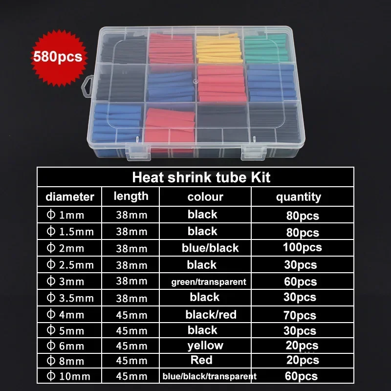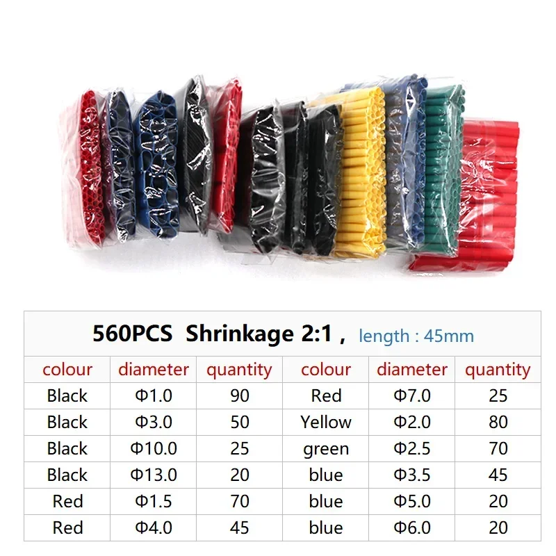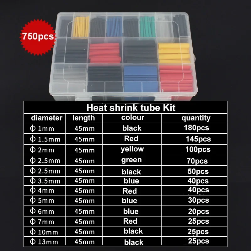 Enhance your electrical projects with this comprehensive heat shrink tubing kit, featuring a 2:1 shrinkage ratio that reduces to half its original diameter when heated to a minimum of +70°C and fully shrinks at +110°C within an operating temperature range of -55°C to +125°C. Made from high-quality polyolefin, PVC, EVA, and other durable materials, it provides superior insulation, corrosion resistance, and wear resistance on the outer layer, with waterproof, high-adhesion sealing on the inner layer. The kit includes assorted sizes, with quantities ranging from 127 to 750 pieces, stored in various packaging options, making it an essential addition for electrical wiring, cable insulation, sealing, and protection tasks.