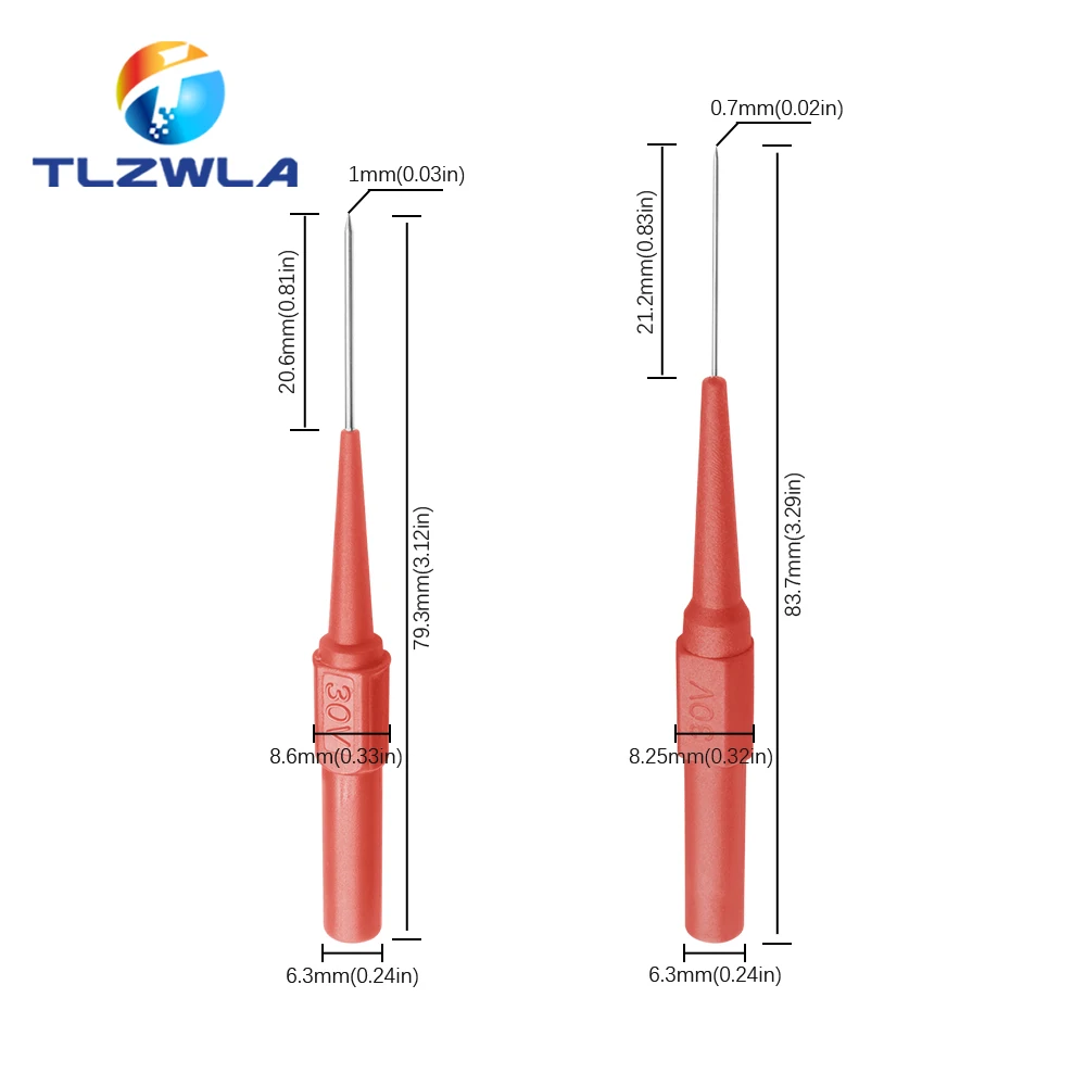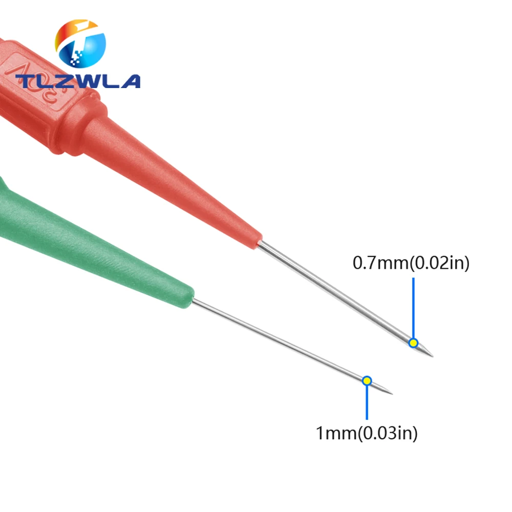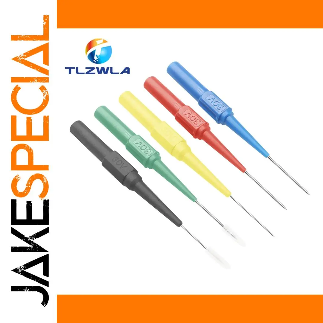 Experience reliable and precise nondestructive electrical testing with this set of five insulation piercing probes, designed for multimeter measurements up to 30V. Featuring 0.7mm and 1.0mm pin sizes, these probes have vibrant, color-coded handles in black, blue, green, pink, red, and yellow for easy identification. The sleek, cylindrical plastic handles are ergonomically tapered for comfortable grip, while the slender, conductive metal tips securely pierce insulation without damaging wiring. Compatible with banana plug connections and operating at 24V, these durable probes meet CE and RoHS standards, making them ideal for professional electronic diagnostics and electrical troubleshooting.