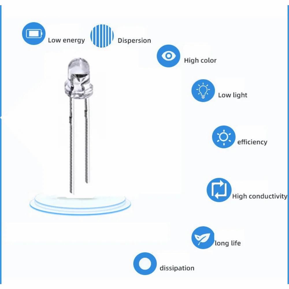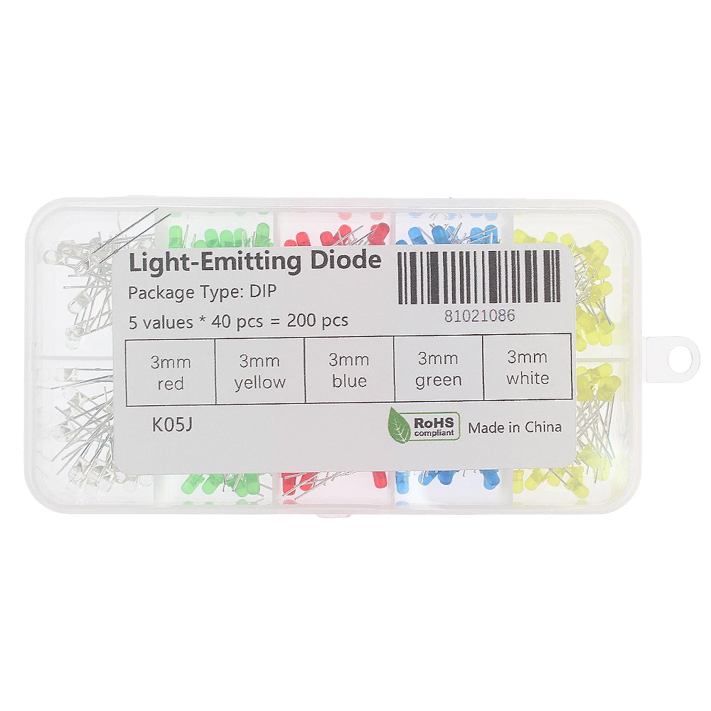 Enhance your DIY electronics projects with this versatile assortment kit of 3mm LED diodes, available in 50 to 200 pieces in vibrant colors including red, green, blue, yellow, orange, white, and multicolor options. Each LED features a through-hole mount with a diameter of 3mm, a forward voltage of 1.8 to 3.2V, and a current of 20mA, offering bright illumination with specifications such as red (600-800 MCD, 620-625 nm), green (600-800 MCD, 567-570 nm), blue (1000-1200 MCD, 460-465 nm), yellow (600-800 MCD, 590-592 nm), orange (600-800 MCD, 590-592 nm), and white (14,000-16,000 MCD, 8000 K). Perfect for education, light decoration, and circuit experimentation, these LEDs provide stable performance and vivid lighting effects.