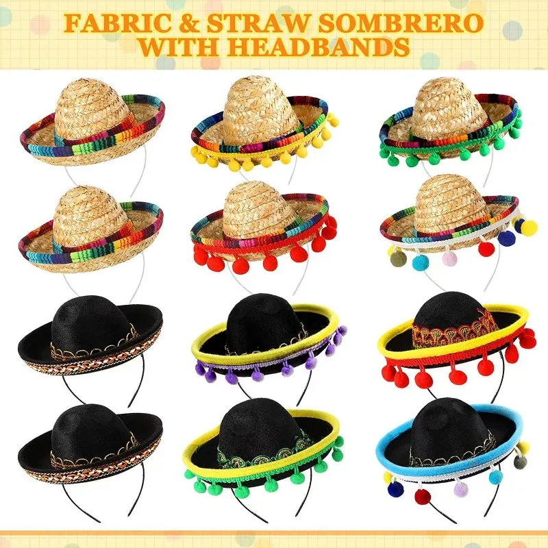 Imagine adding a burst of vibrant fun to your child's costume or celebration with this adorable collection of Mexican mini hats. Crafted with attention to detail, these playful accessories come in lively colors and festive designs perfect for festivals, Halloween, or cultural events. The black hats feature bright embroidery and red pom-poms, while the straw-colored ones highlight traditional weaving and multicolored bands. Mounted on adjustable headbands, they provide a comfortable fit for children, instantly transforming any outfit into a memorable look. They’re ideal for parties, themed festivals, or fun photo sessions, making your child's celebration stand out with cheerful, cultural flair. Bring joy and color to your next event with this delightful accessory set.