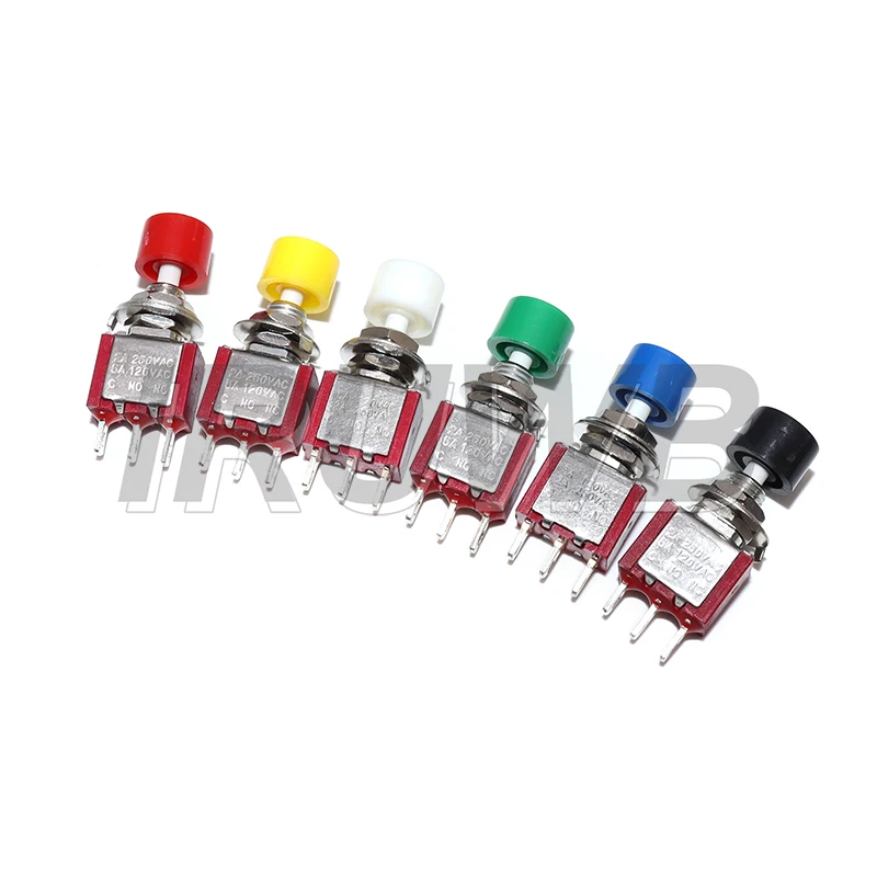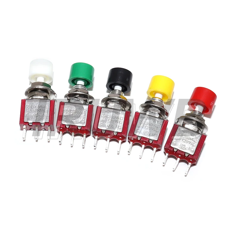 Transform your electronic projects with this set of five vibrant mini push button switches, each measuring just 6mm. Built with a durable metal body and topped with smooth plastic caps in red, yellow, white, green, and black, these switches blend industrial strength with eye-catching color. Designed for reliable, high stability operation, they feature a momentary automatic return mechanism, making them perfect for control panels, DIY electronics, or circuit testing. Equipped with three pins (common, NO, NC), supporting ratings of 2A at 250VAC and 5A at 120VAC, these switches incorporate high self-healing performance for prolonged use. Their compact size and robust construction make them ideal for space-constrained applications requiring reliable electrical switching.