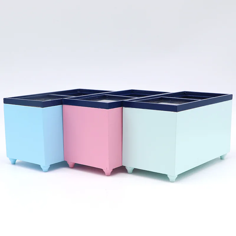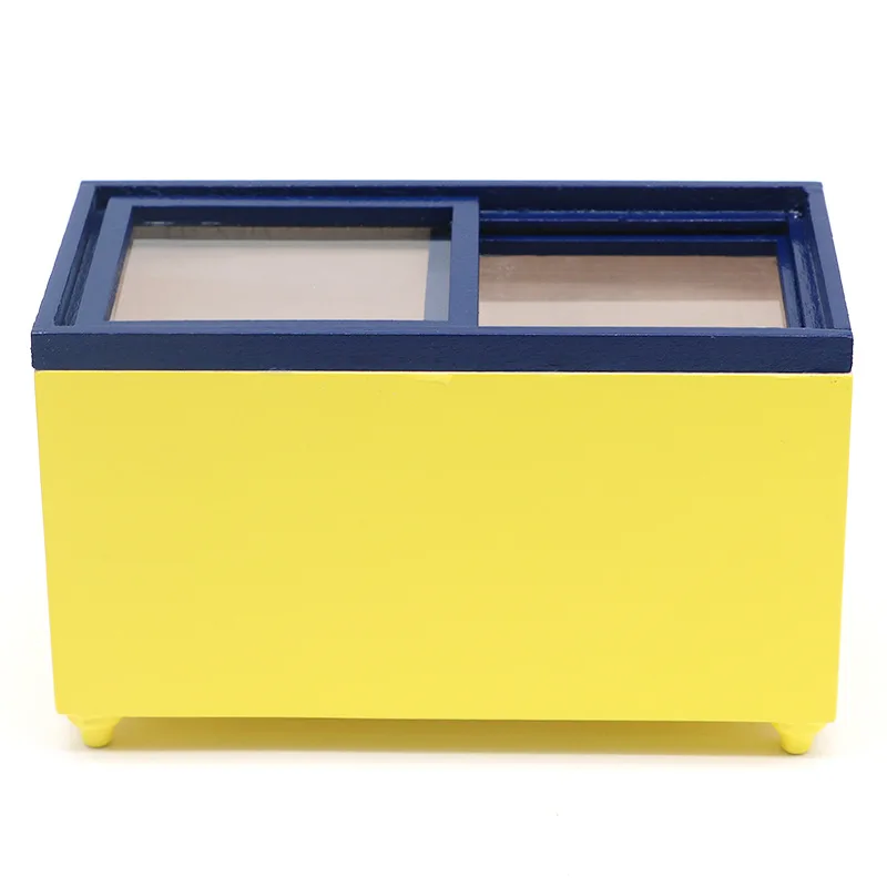 Step into a vibrant world with this delightful set of miniature dollhouse freezers, perfect for inspiring your imagination. These colorful, playful accessories add a lively touch to any dollhouse scene, bringing a realistic yet whimsical feel to your miniature universe. Crafted from durable wood, each freezer showcases bright hues such as yellow, purple, mint green, blue, pink, and white, complemented by elegant dark blue frames around the glass lids. The clear three-section lids reveal tiny bottles inside, mimicking busy kitchen or convenience store scenes. With precise dimensions and detailed design, these freezers make your dollhouse displays more authentic and engaging. They are ideal for collectors, hobbyists, and enthusiasts eager to create a charming miniature environment.