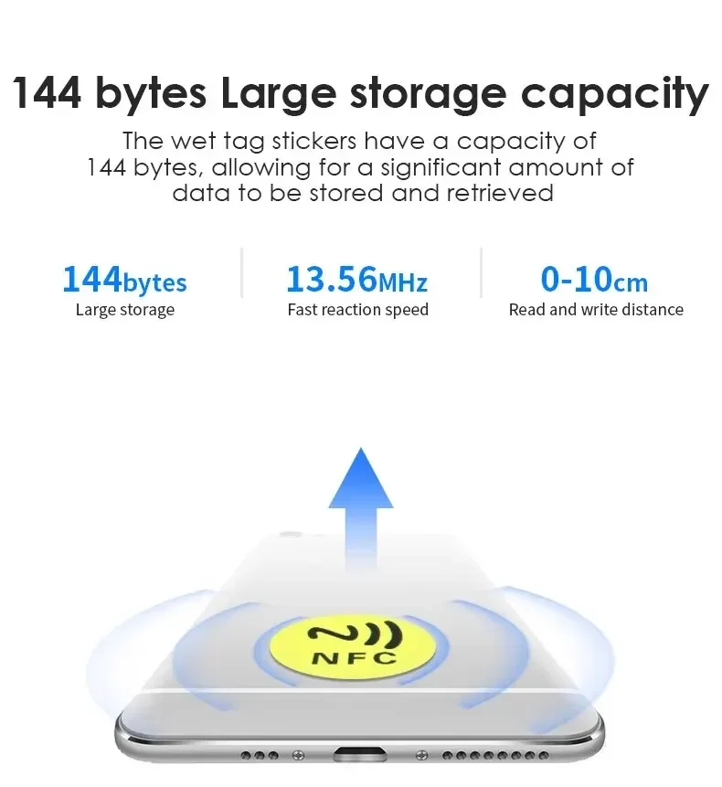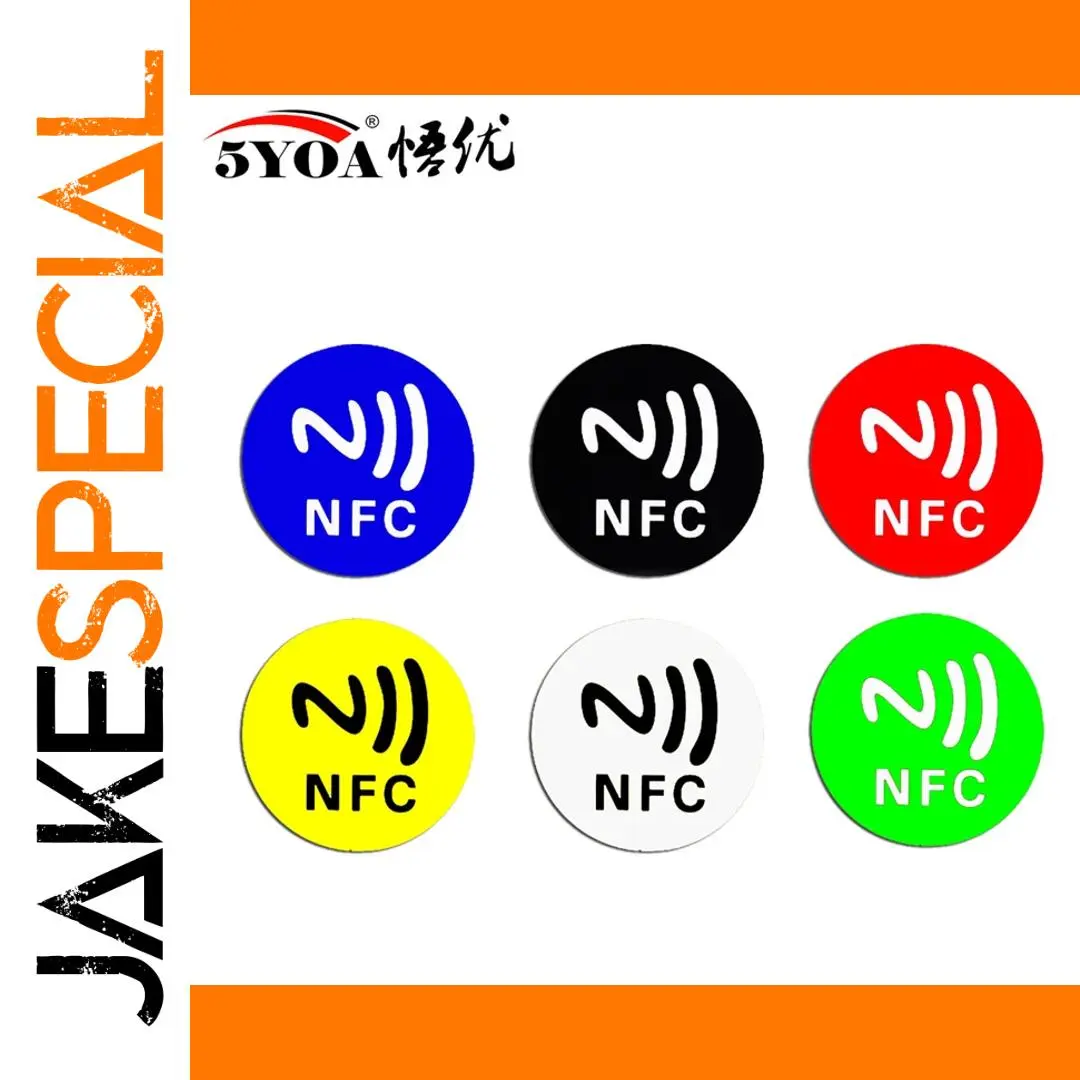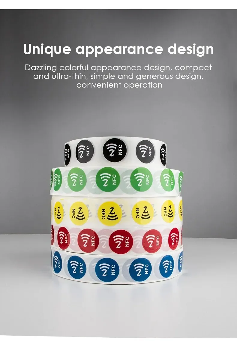 Enhance your NFC and RFID interactions with this set of 6 colorful, circular NFC Ntag213 wet stickers, each 25mm in diameter with a glossy surface for a sleek appearance. Operating at 13.56 MHz under the ISO14443A protocol, these stickers offer 144 bytes of data storage, supporting over 10 years of reliable use and more than 100,000 read/write cycles. Designed for non-metal surfaces, they are compatible with a variety of NFC-enabled smartphones, including iPhone 13 Pro, Huawei, Samsung, Sony, HTC, Nokia, and LG, as well as RFID reader/writers like Acr122u. Versatile and durable, these stickers are ideal for mobile payments, access control, business cards, and more.