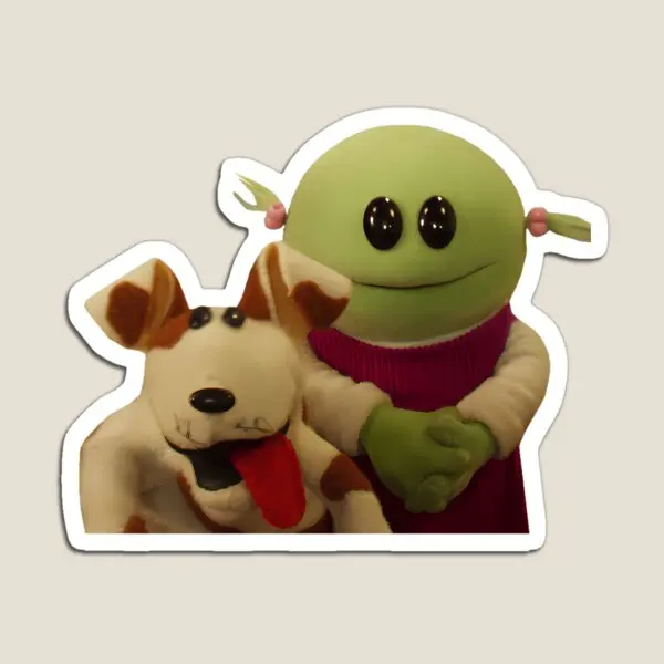 Bring joy to your space with this vibrant refrigerator magnet, showcasing a cheerful cartoon figure with a rounded green head, large shiny eyes, and a simple smiling mouth that exudes friendliness. The character wears a bright red outfit, with tiny ears or antennae tied with green ribbons, adding to its whimsical charm. Adjacent is a cuddly plush stuffed dog, light-colored with darker patches, floppy ears, and a friendly expression, complete with a black nose and red tongue. The lively design emphasizes bold colors and smooth textures, making it appealing for children and fun home decor. The magnet's custom-cut shape around the characters enhances its engaging look, perfect for decorating fridges, lockers, or magnetic boards in a child's room or playful spaces.
