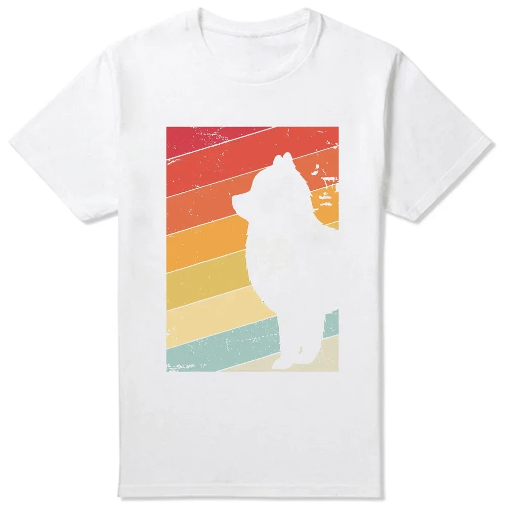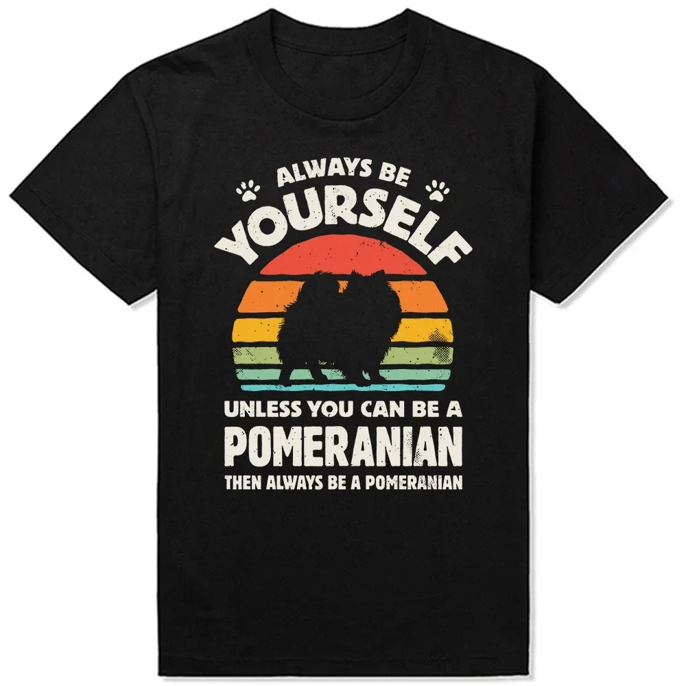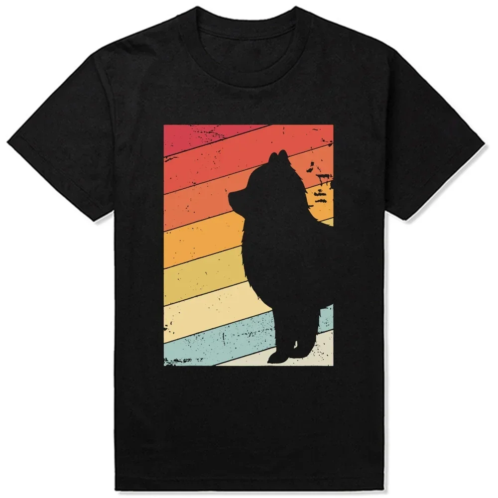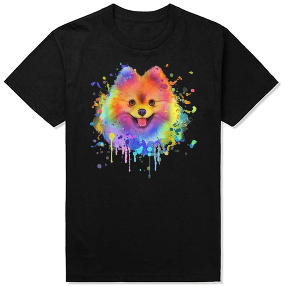 - This casually styled men's T-shirt features a vivid graphic of a fluffy Pomeranian in playful colors, capturing attention with detailed fur and a cheerful, whimsical expression.